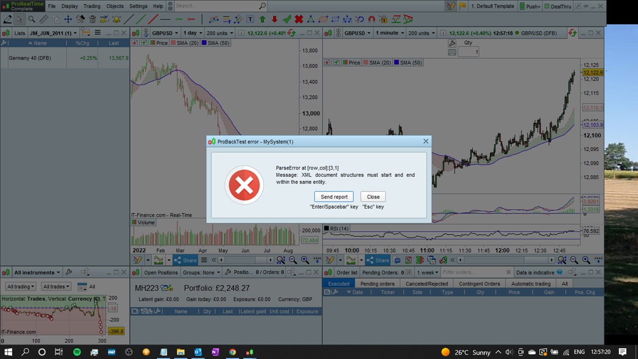 I have in the past received a ‘Parse Error’ message on the screen (see attached) and by uninstalling and then installing a fresh copy of IG Index PRT the problem went away for several weeks.