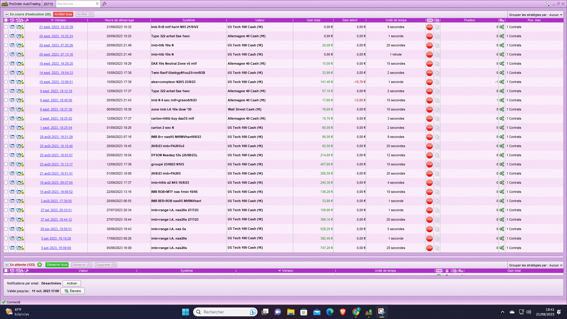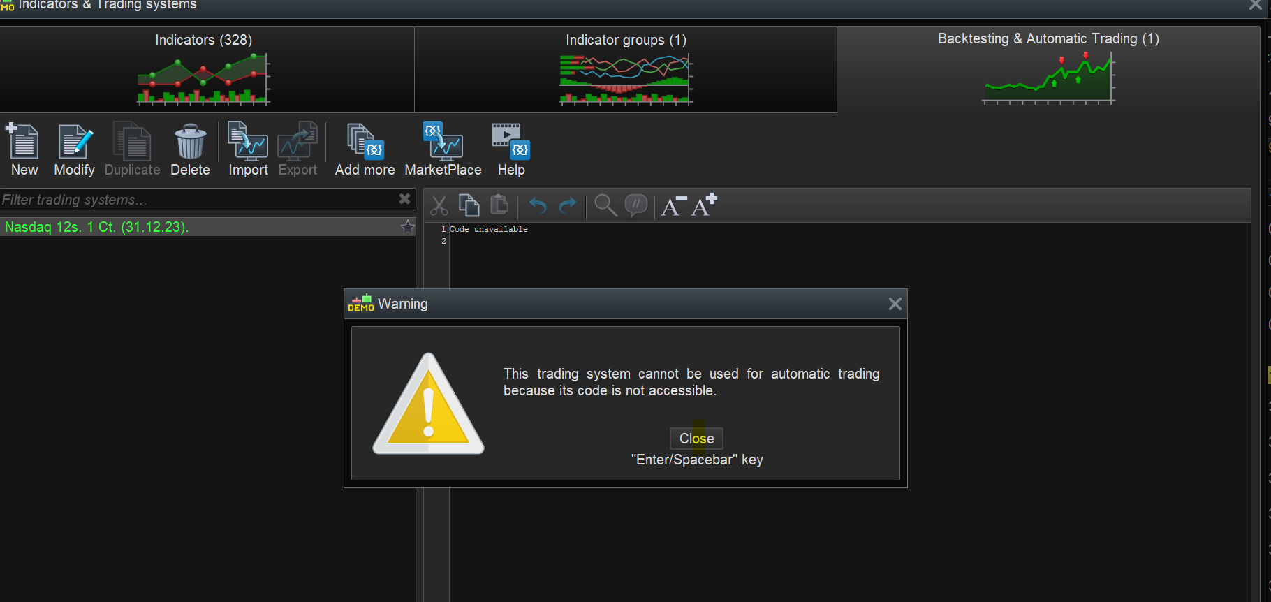 Oui c’est le fonctionnement classique, on ne peut pas trader de boîte noire dans ProOrder. Avec ce type de code protégé (code non lisible), on pourra faire des backtests uniquement.