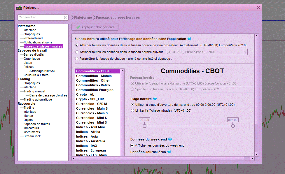 plateforme réglé comme l’image jointe, le code fonctionne sur Nasdaq en time frame 12 sec, avec 1 contrat.