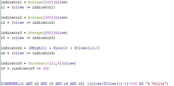 j’aimerai les instruments financiers où ” prix > moyenne mobile ( 100, 300, 600, 1000) ET prix > point pivot ET stochastique en survente “.