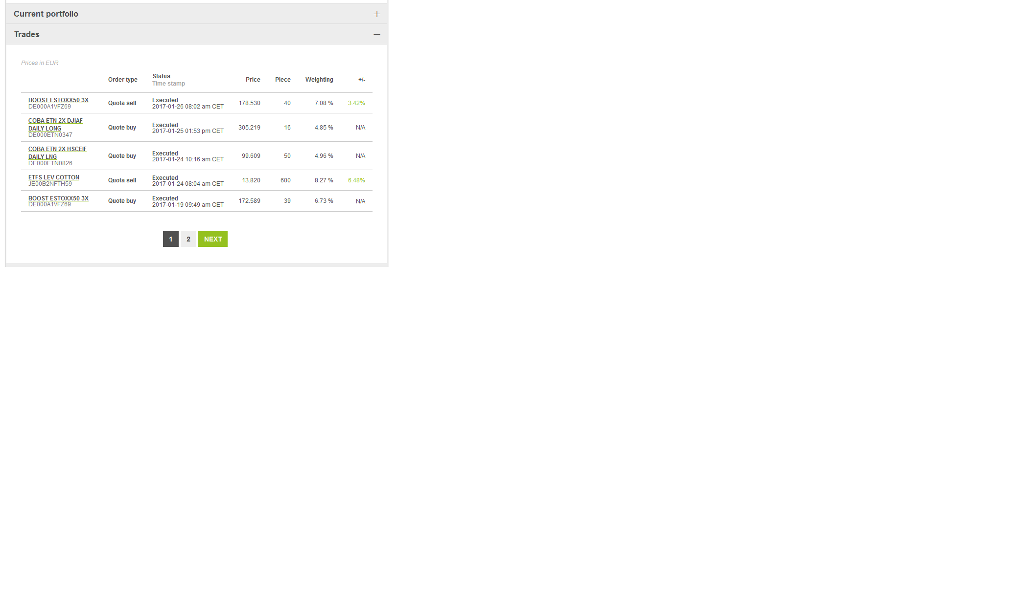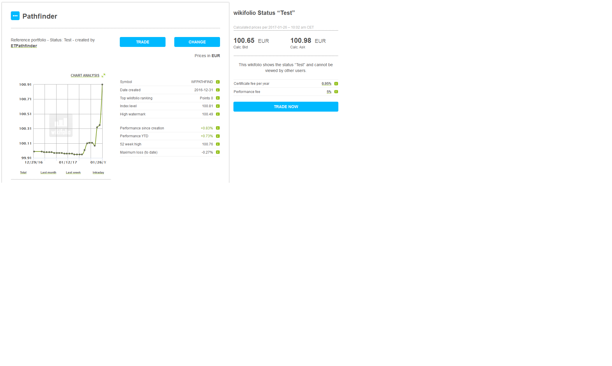 I have founded a Pathfinder hedge fund :-). I used the wikifolio.com platform and created a Pathfinder wikifolio to have a visible track record of my ETF trades. I’m trading a selection of Pathfinder 4H and swing robots with the help of leveraged ETP products (ETF, ETC and ETN). First issue price was 100 Euro and my goal is an annual performance of 15-20%. Portfolio management should be conservative. The fund had a good start so far.