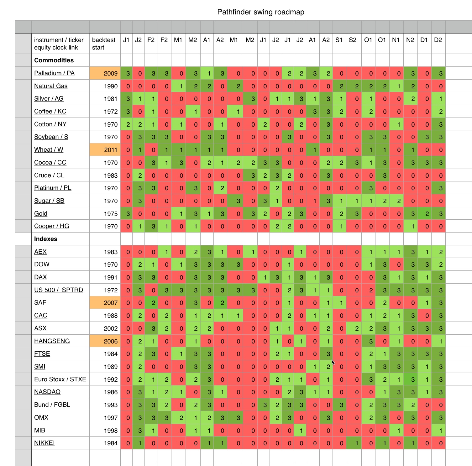 please find attached the Pathfinder swing roadmap for the whole year. I have tested 30 instruments with Pathfinder daily V2 to find the best possible setups for this idea. I found some additional instruments such as Cotton, Wheat, ASX, SMI and SFA. What you see here is the best seasonal adjustments for the maximum available data history tested with PRT premium 10.2 for IG. All tests focused on the two well known Pathfinder TS quality criteria 70% profitable trades and 25% maximum drawdown.