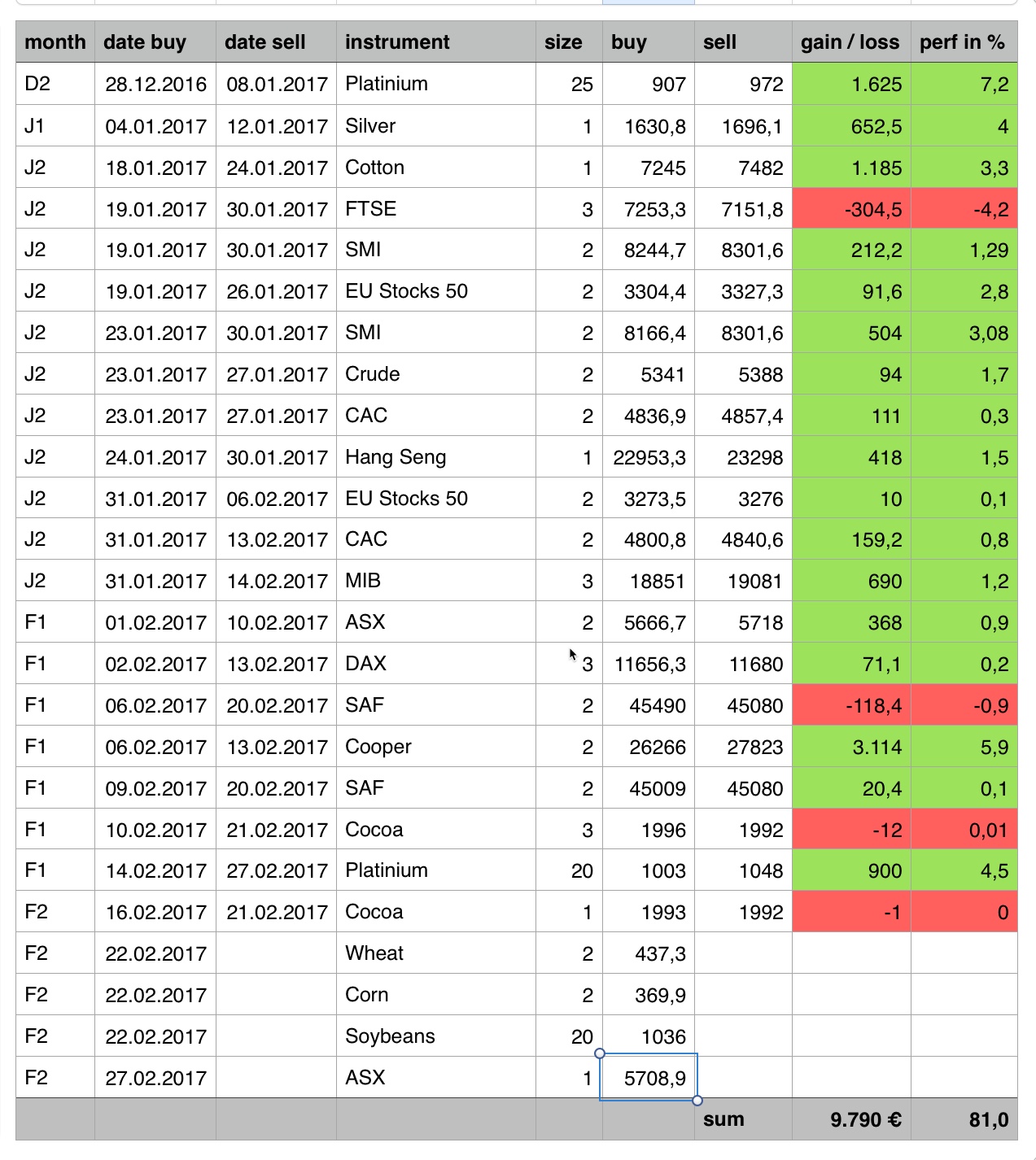 Platinium position was closed at 1048 with 900 Euro profit and a ASX position was opened at 5708