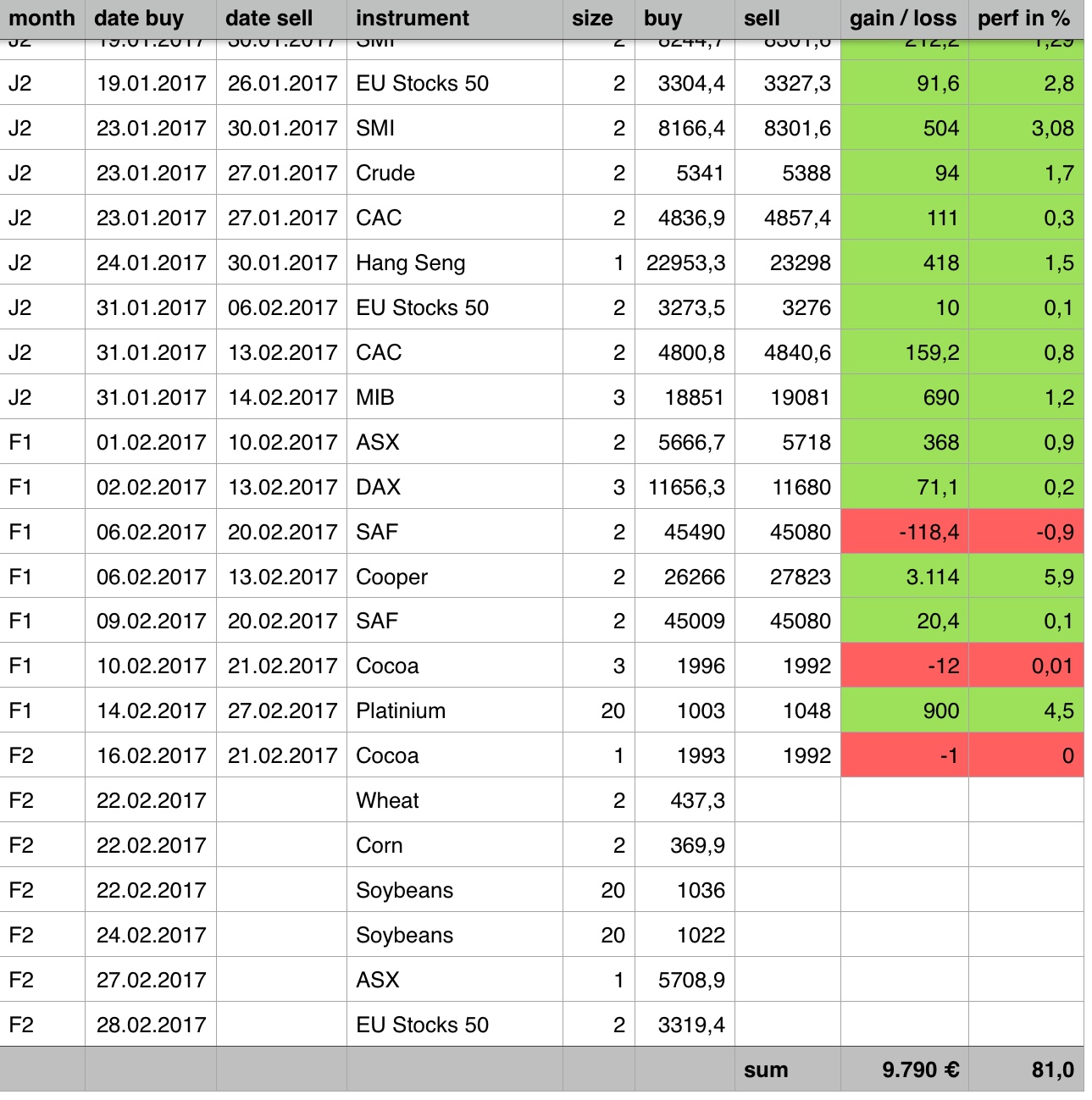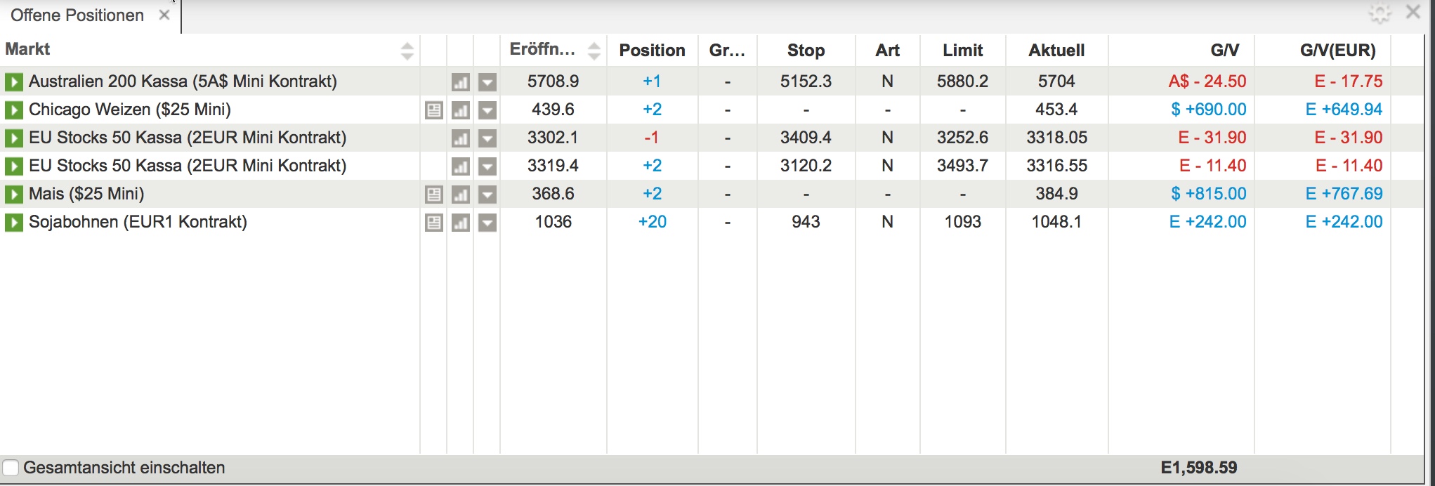 In my opinion the Soybean position is a little bit to high for the default 10K account size. You have now a risk of 60 Euro per point. I have to admit that all grains are to aggressiv if further positions were accumulated.