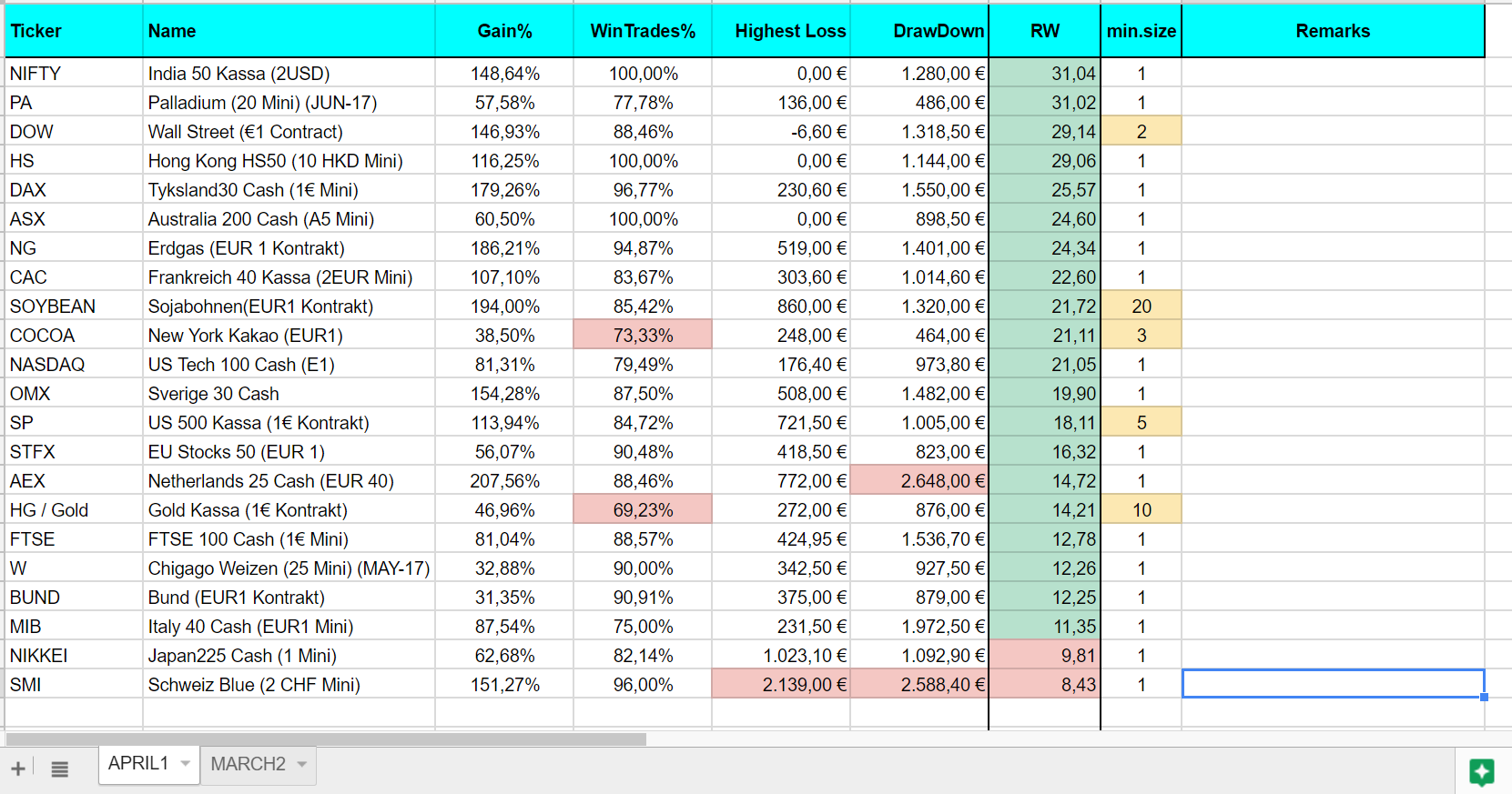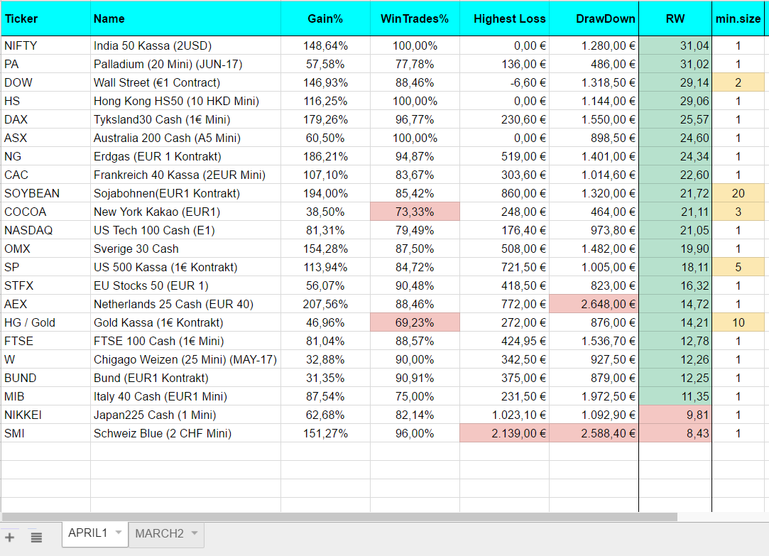 The trades sum up to a year total of 5.137,57 € with a loss of 512,29 € in the month march. The Spot Gold trade really did hurt.