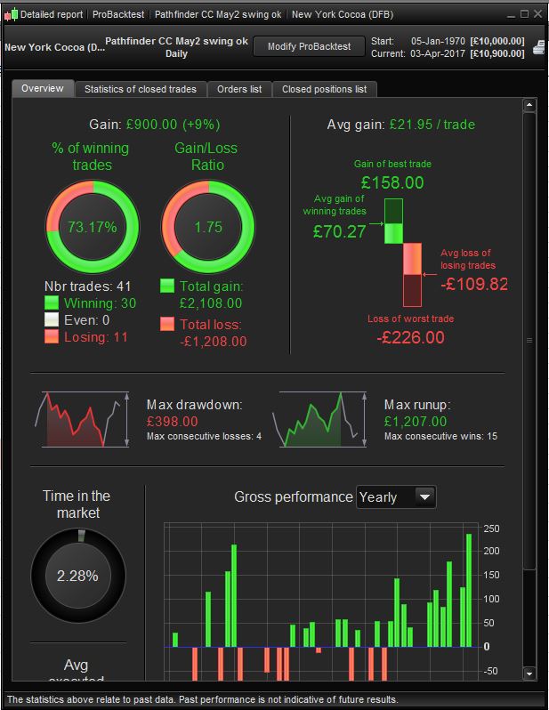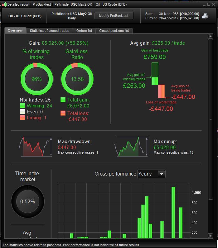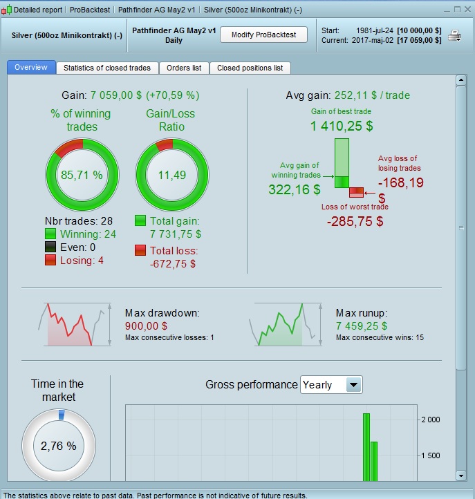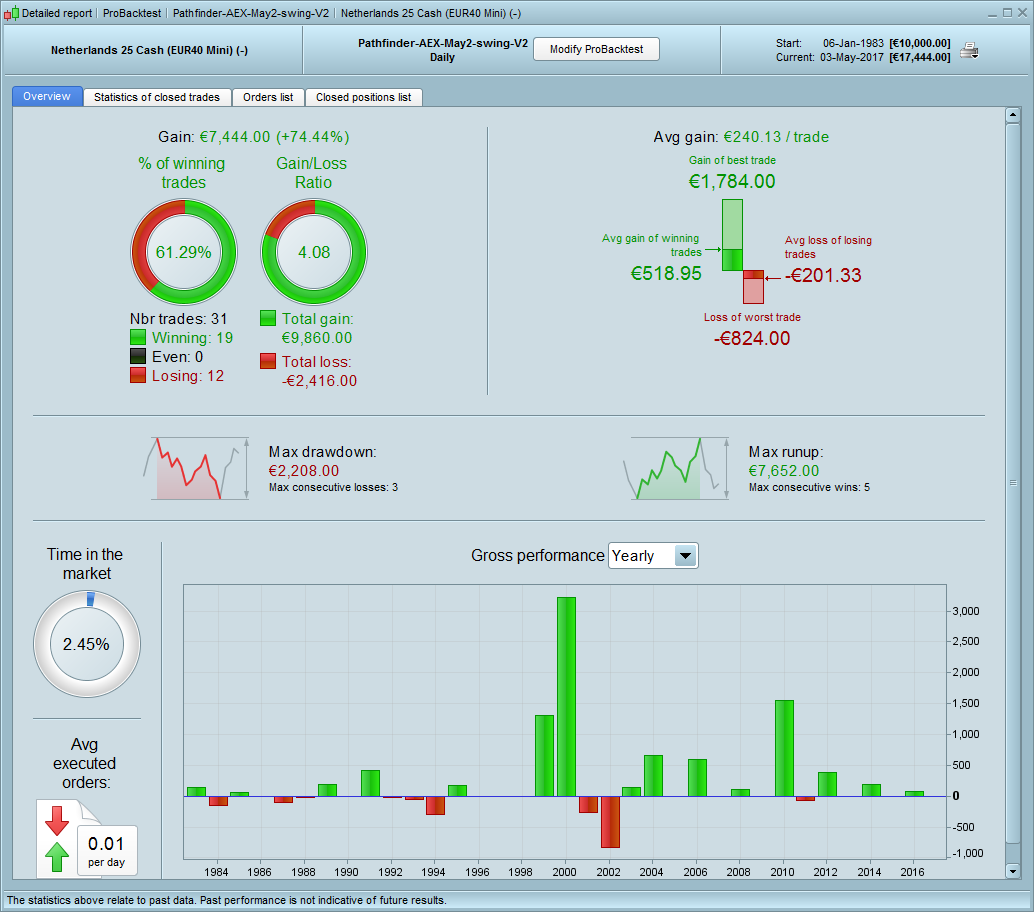 Pathfinder swing idea based on the concept that the robots accumulate positions in the correction of a potential up trend. This logic means that most of the positions are in loss at the beginning and I have the feeling that this is hard for some of the traders. With the variable maxProfit the position will closed at the next open bar if the profit is above that level. With this little logic the number of profitable trades can be increase but of course it will limit the potential profit as well.
