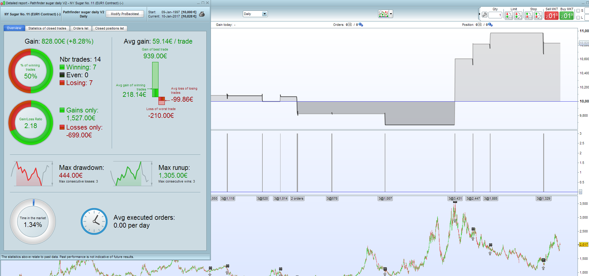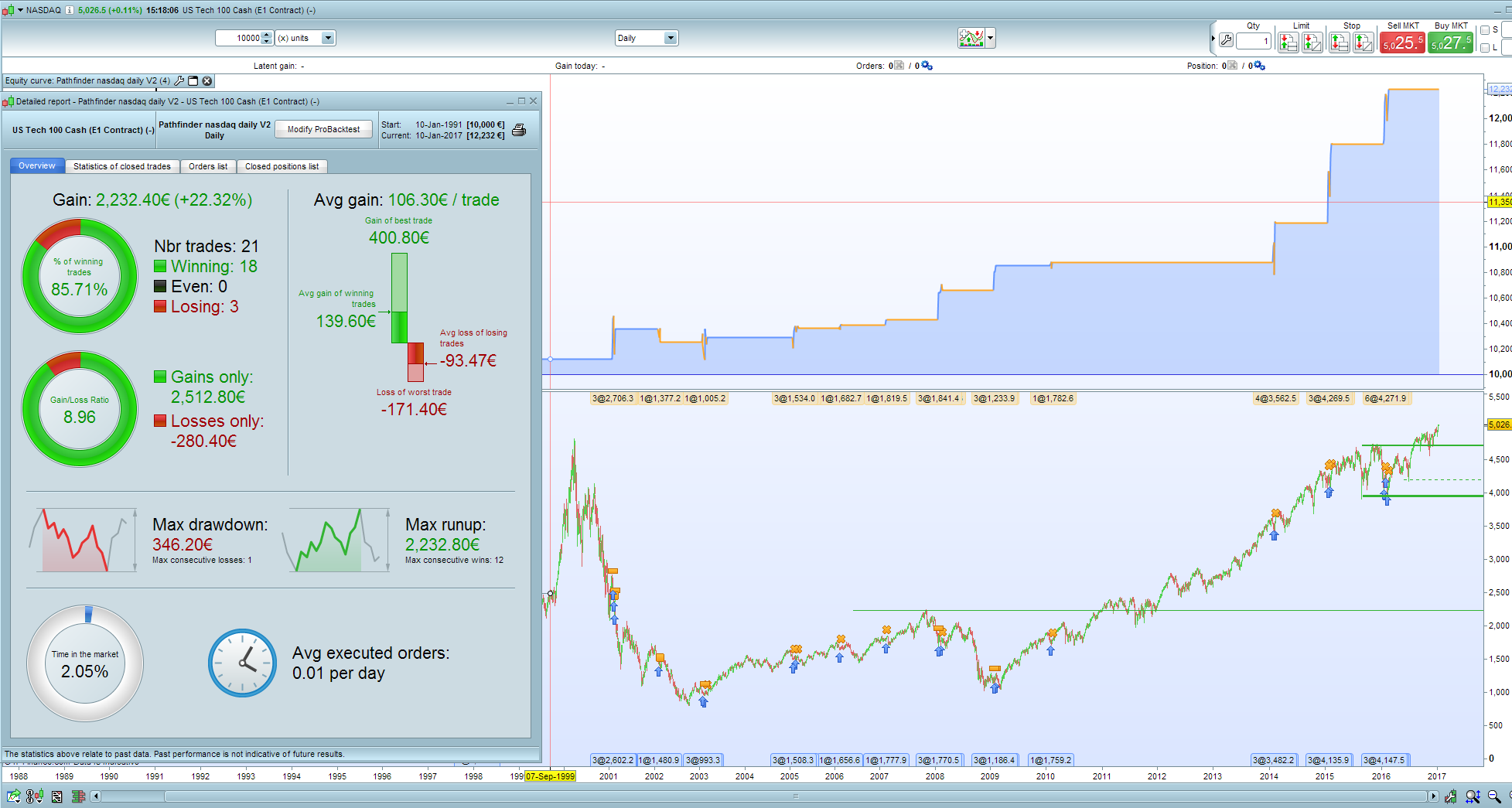 The result of the Pathfinder_DOW_Daily_Jan2_V2 gives a total of 13 operations since January 2, 1970, 10 positive and 3 negative (76.92%), total earnings 3023.60 euros and total losses 189.80 euros. The drawndawn that gives the backtest is a bit higher than 25%, but the actual loss is very low.