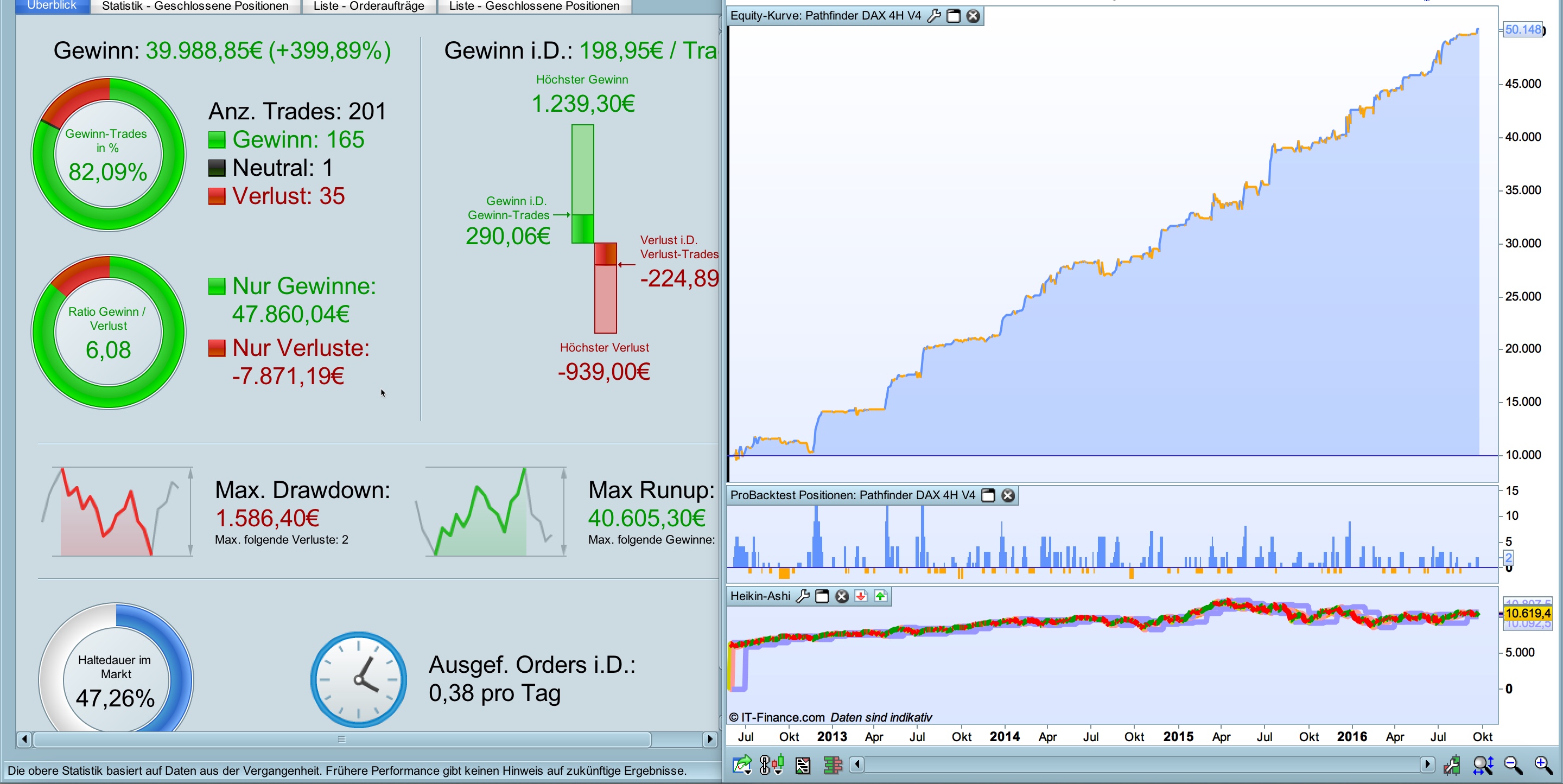 The Pathfinder breakout logic works well for many instruments with 24 hour quotes such as DAX, DOW, FTSE, Hang Seng, NIKKEI in 4 hours timeframe. All versions are optimized for an 10k Euro account.