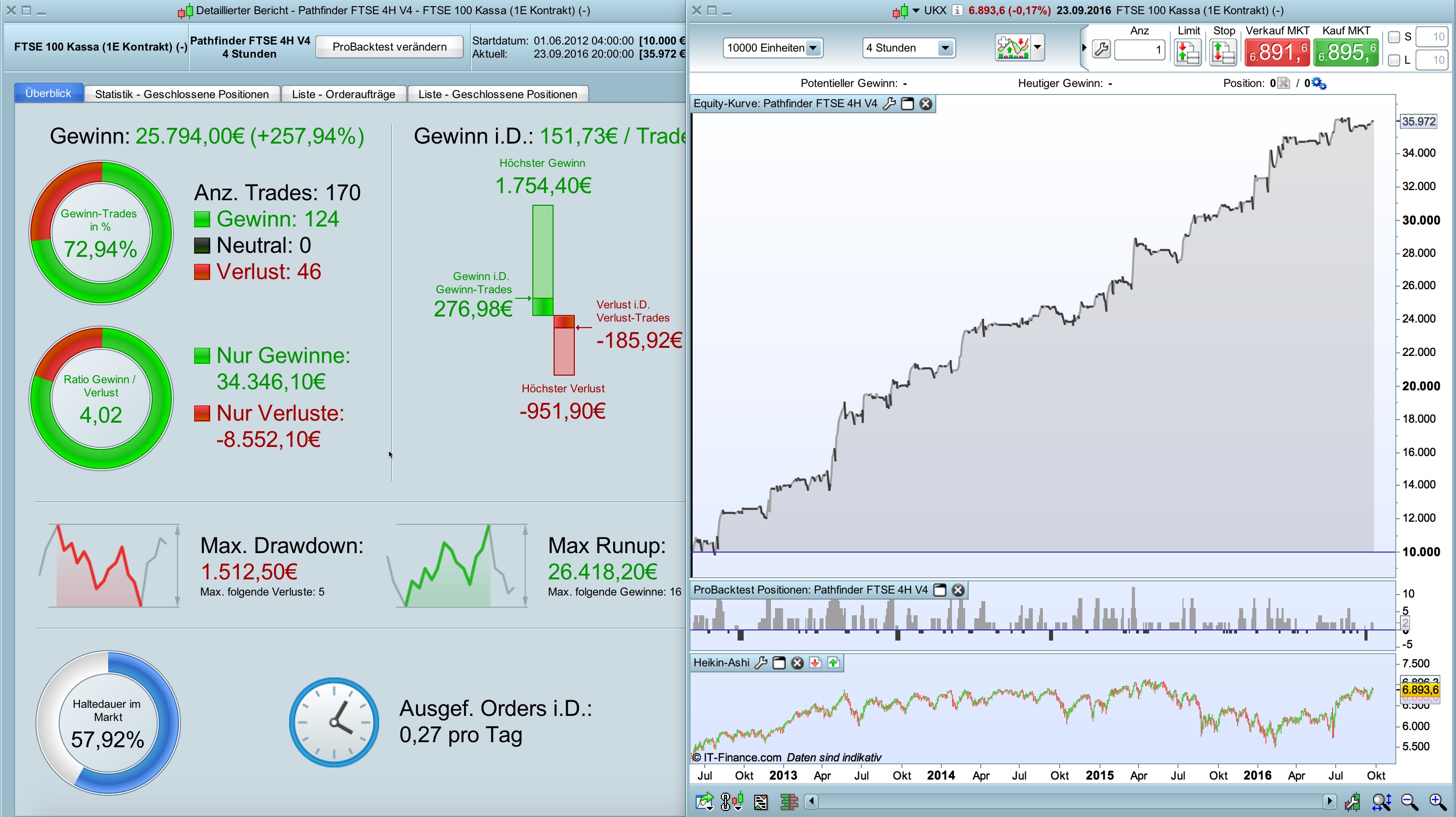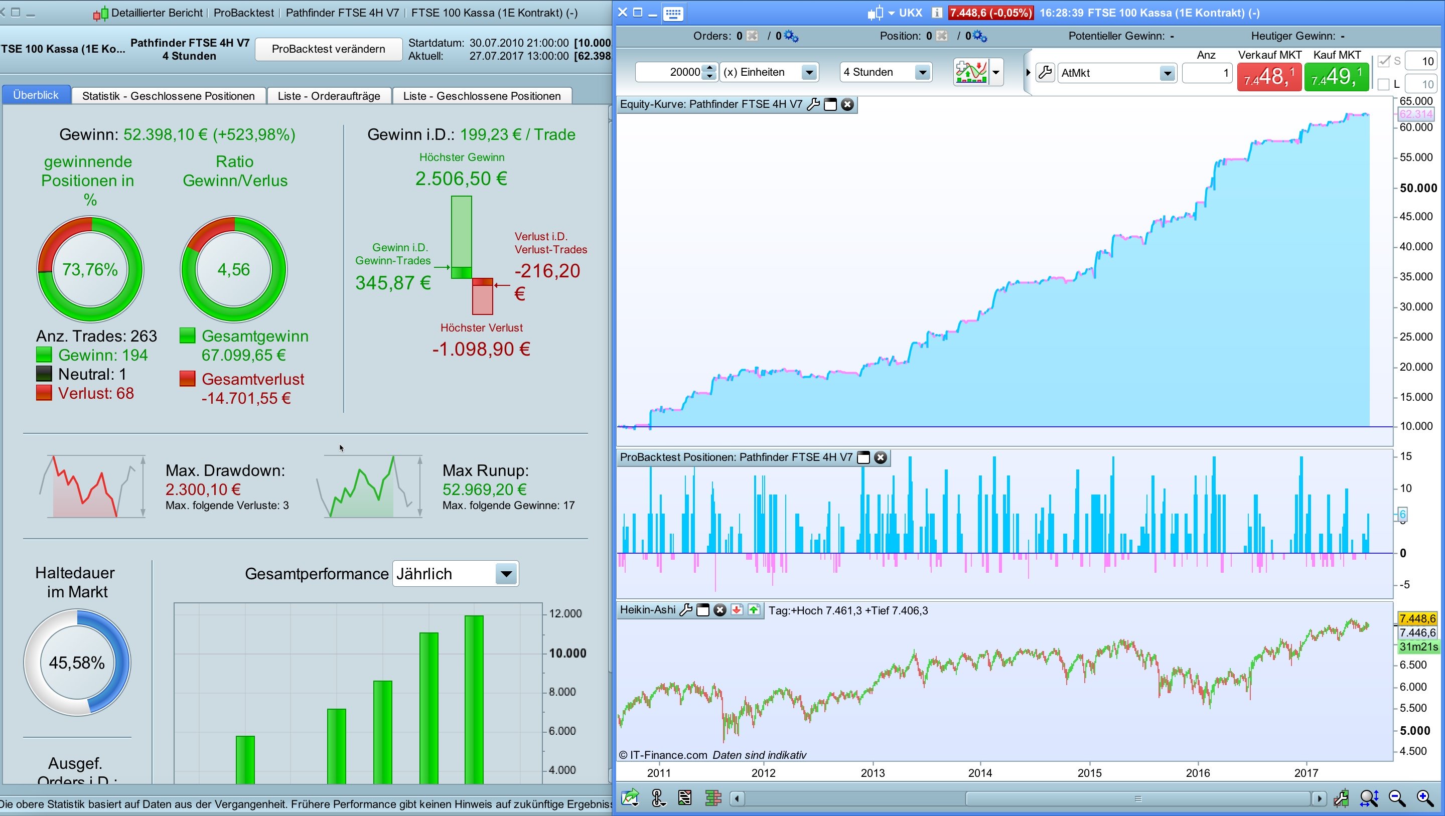 I adapted Pathfinder V4 on FTSE and DOW. Due every index has it’s own “heartbeat” minor adjustments were necessary. Please be aware that this is an optimized view to historic data. Please check the position size and the related drawdown and adjust it to your own risk.