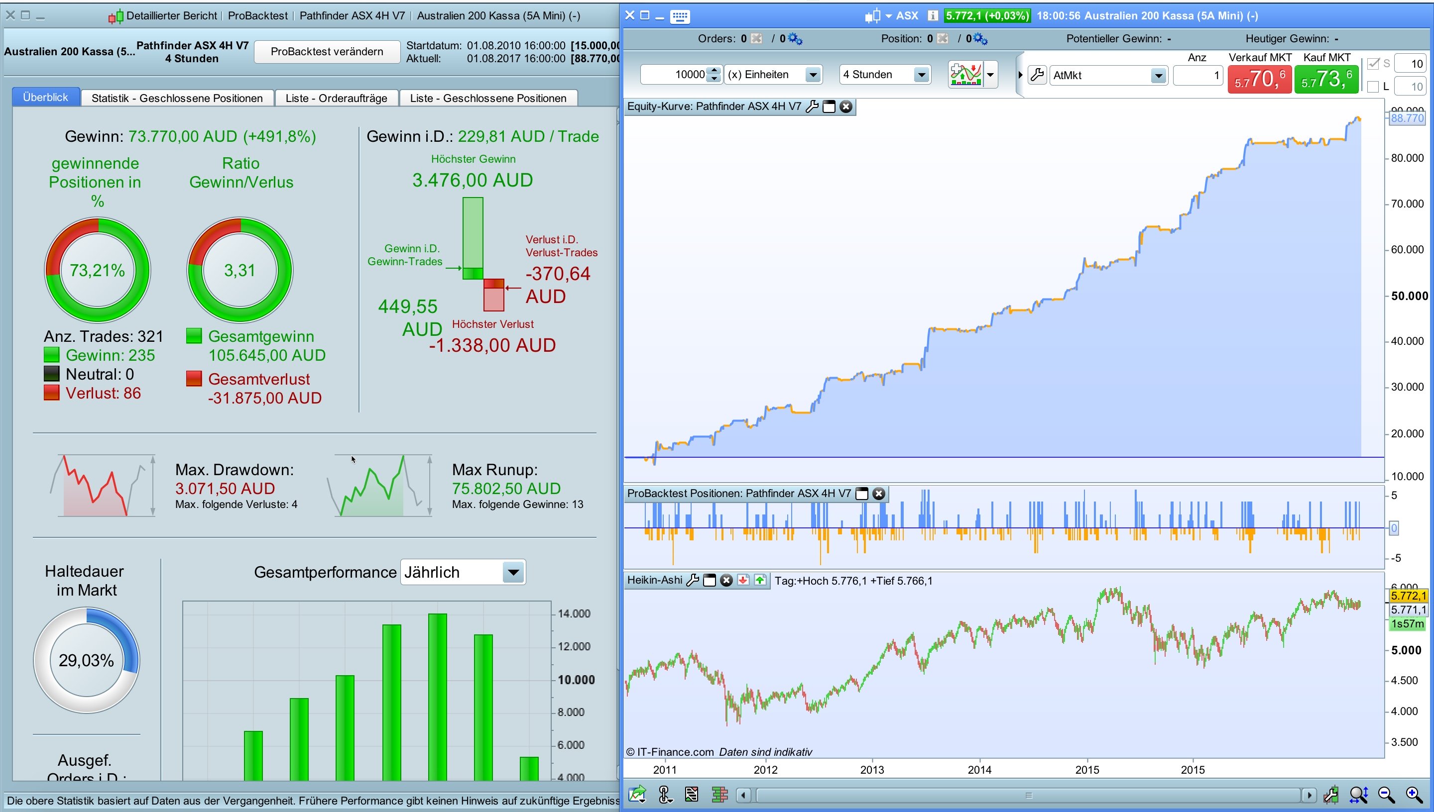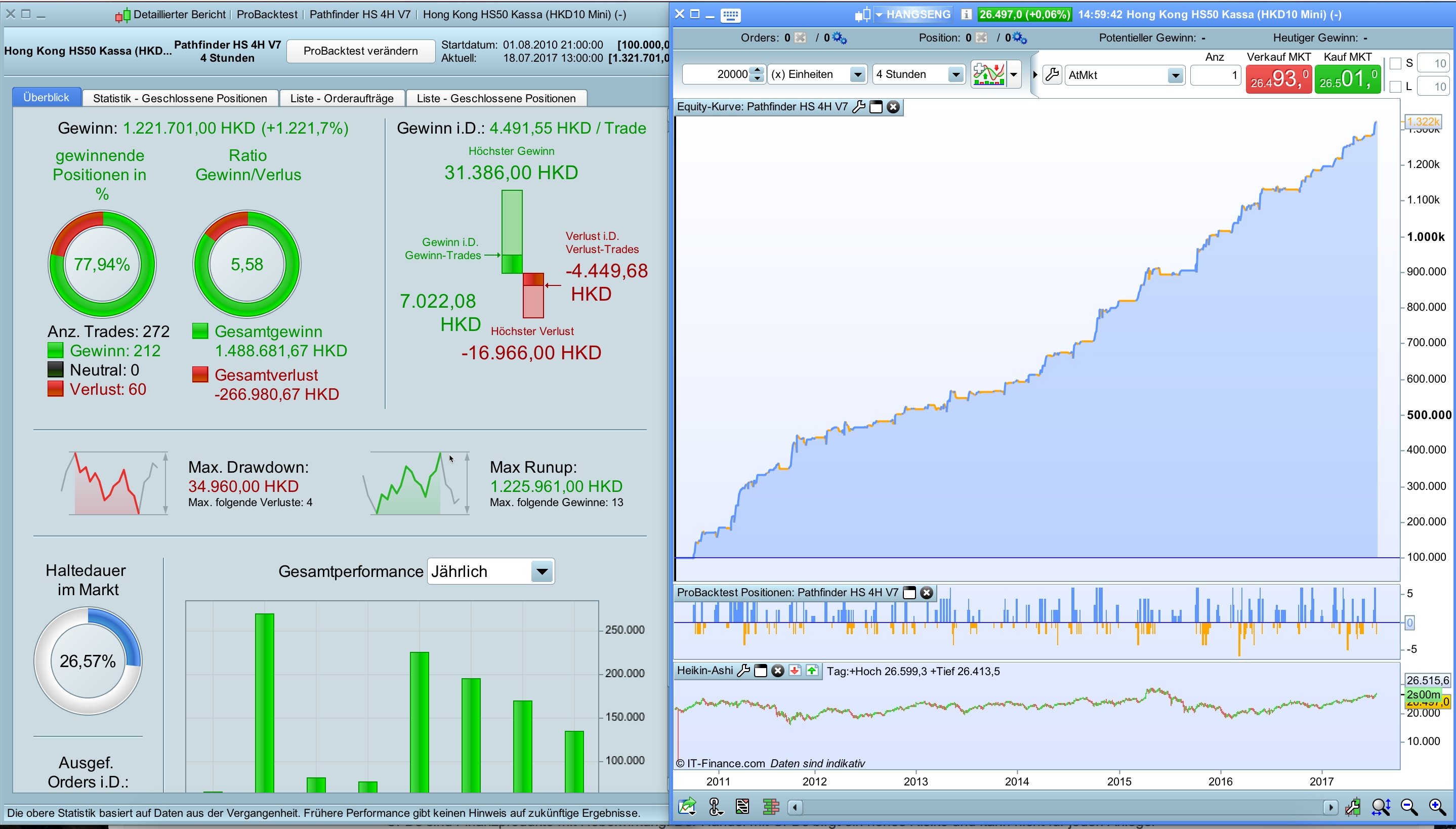 Pathfinder strategies offer a statistical advantage but are of course not a holy grail and there is no guarantee to make money with it. The systems are optimized for historical data and historical gains are not a guarantee to be successful in the future. I strictly recommend to adjust the position sizes to your personal account size and try first in demo mode. The results in life trading will differ from the backtest results. I also recommend to start in life trading with a small account size. Anyone can use the programs for free and at their own risk.
