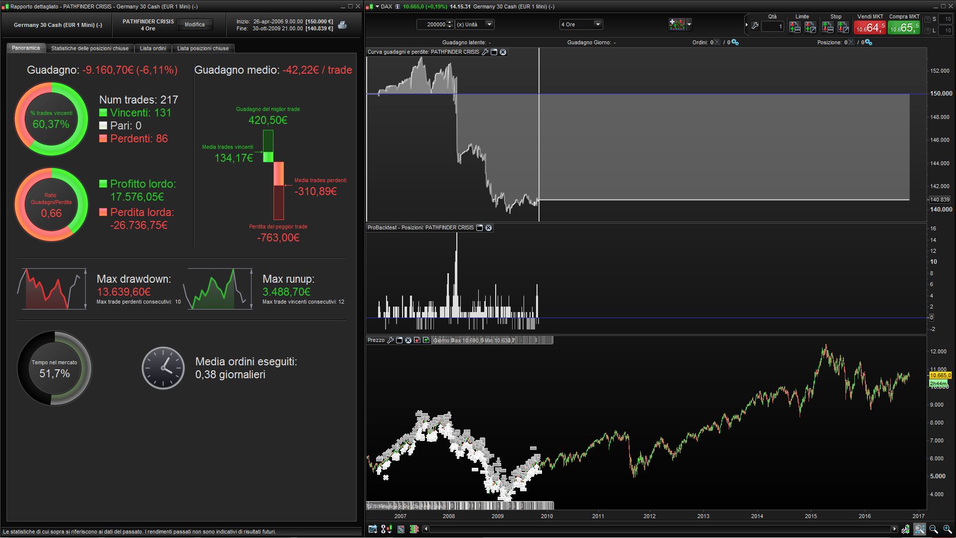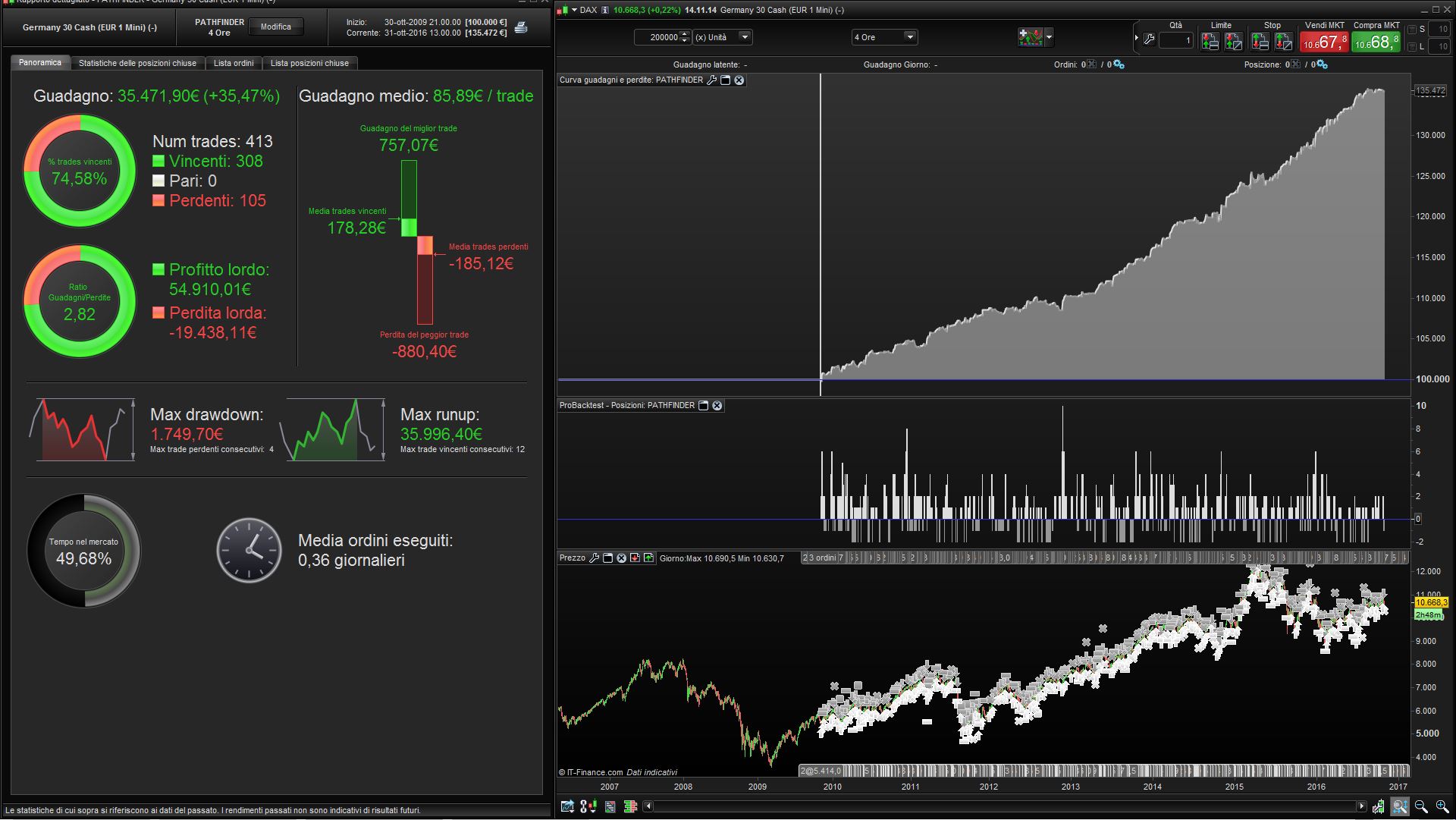 Pathfinder’s trading algorithm based on the availability of 24h quoting (6 H4 candles per day). This feature was available for DAX since August 2010 this means that Pathfinder V5B2 parameter settings probably doesn’t work before that date.