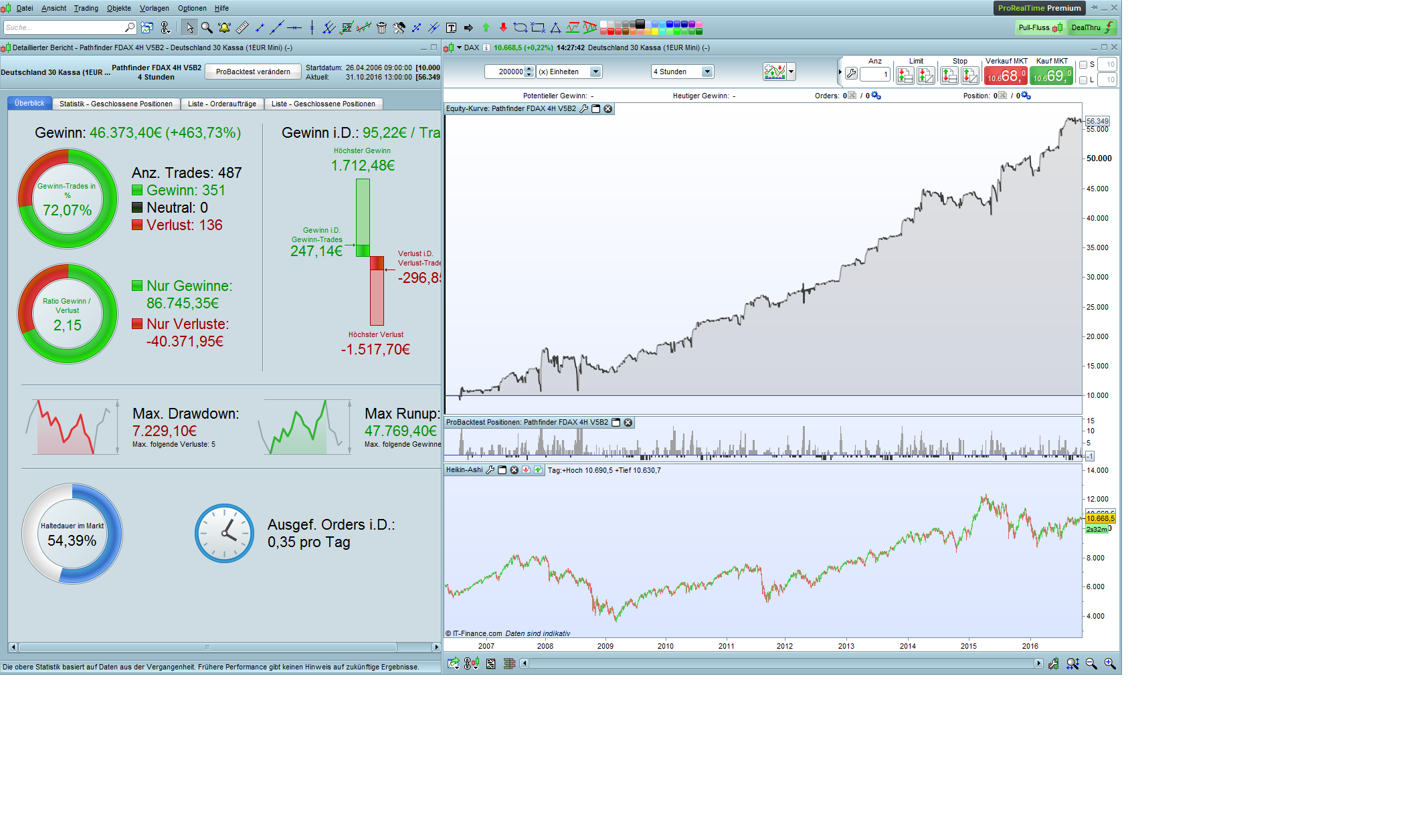 Please find attached an adapted Pathfinder DAX backtest from 2006 – 2016 reduced to core trading hours 8 – 22 CET (availability of 4 x 4H candles over the whole time period). 24 hours quotes and availability of weekend data makes the system significantly better.