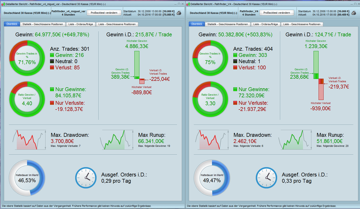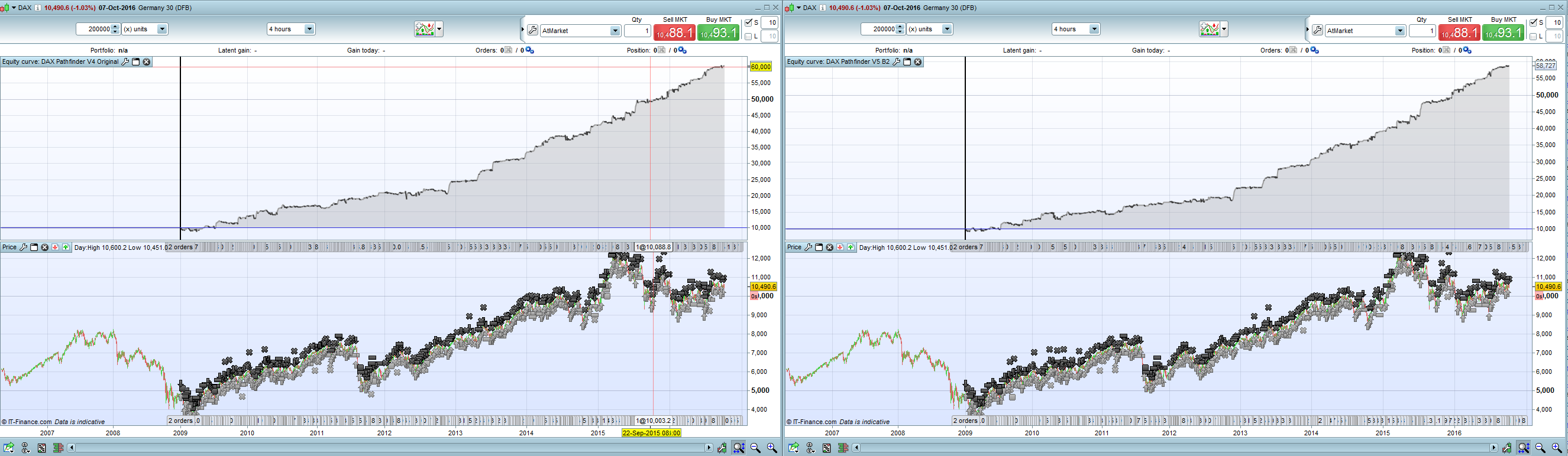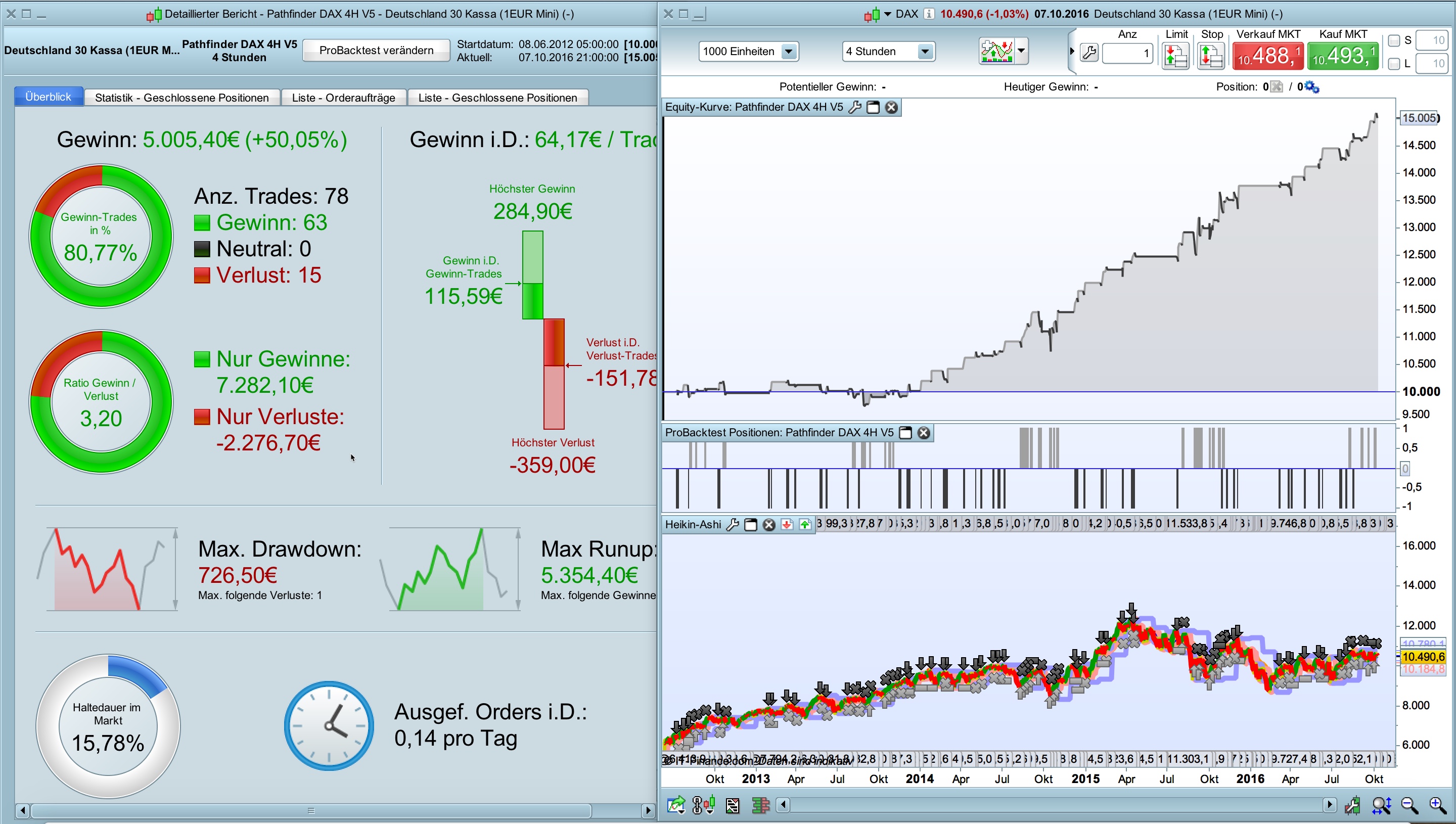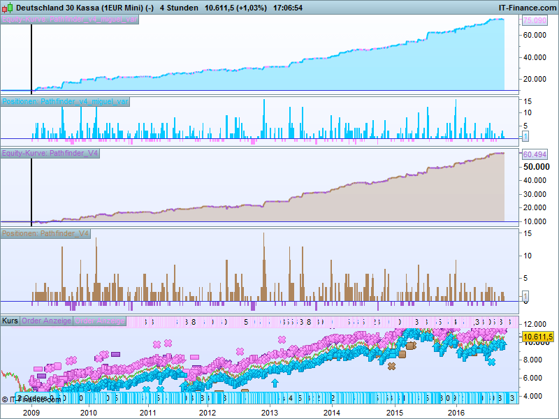 Thanks for your contributions, I appreciate your review. You are absolutely right, 15 “naked” DAX mini contracts are too much for an 10k account. Please be aware that Pathfinder cumulated the position size only in very strong trends especially on the long side. The “signalline” has to crossed over the daily high (add pos), the weekly (add pos) and the monthly (add pos). When this extremly bullish scenario happens Pathfinder go “all in” and cumulate aggressiv the position. With the last trade the others are already in profit. This behavior is one of the booster of Pathfinder and the backtest showed since 2009 that the system were never in trouble with this logic.