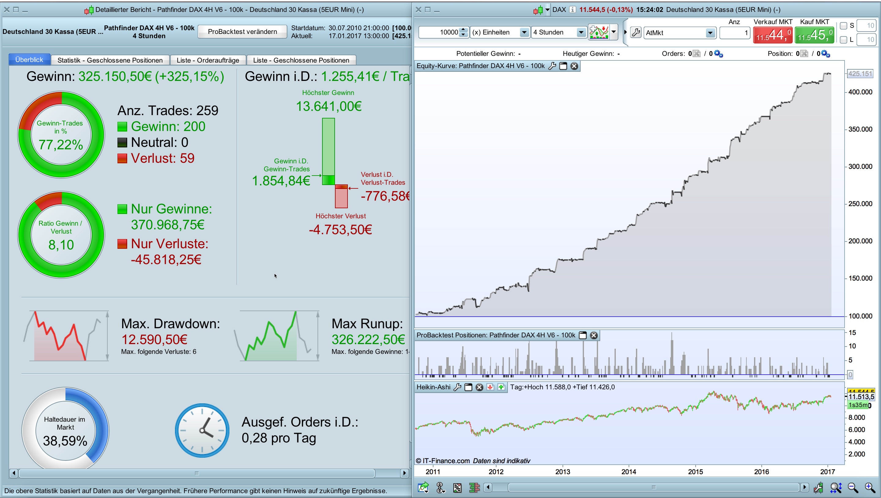 In my opinion a good approach for a 100k account would be to trade the DAX mini 5Euro contract instead of DAX mini 1Euro. Enclosed is a version for an 100k account and DAX mini 5Euro. I can’t recommend to trade Pathfinder with a full DAX 25Euro future.