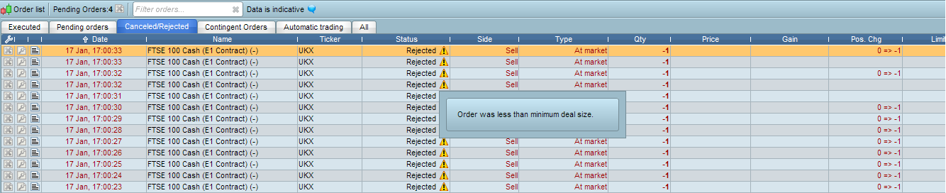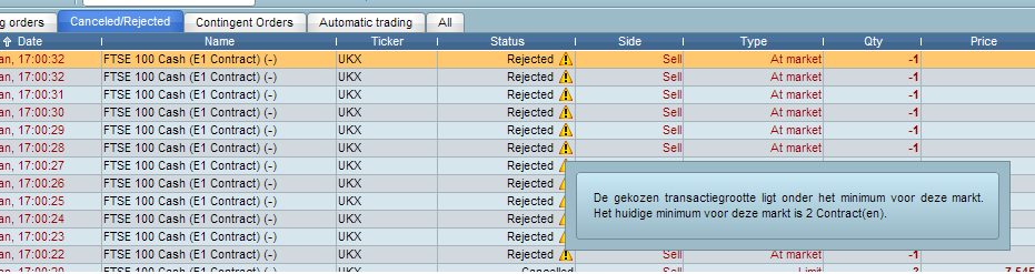 It gave a lot of rejected orders. It gave an error -> The minimum order size was 2 for ftse. The orders where rejected at 17:00. System was automatically stopped.