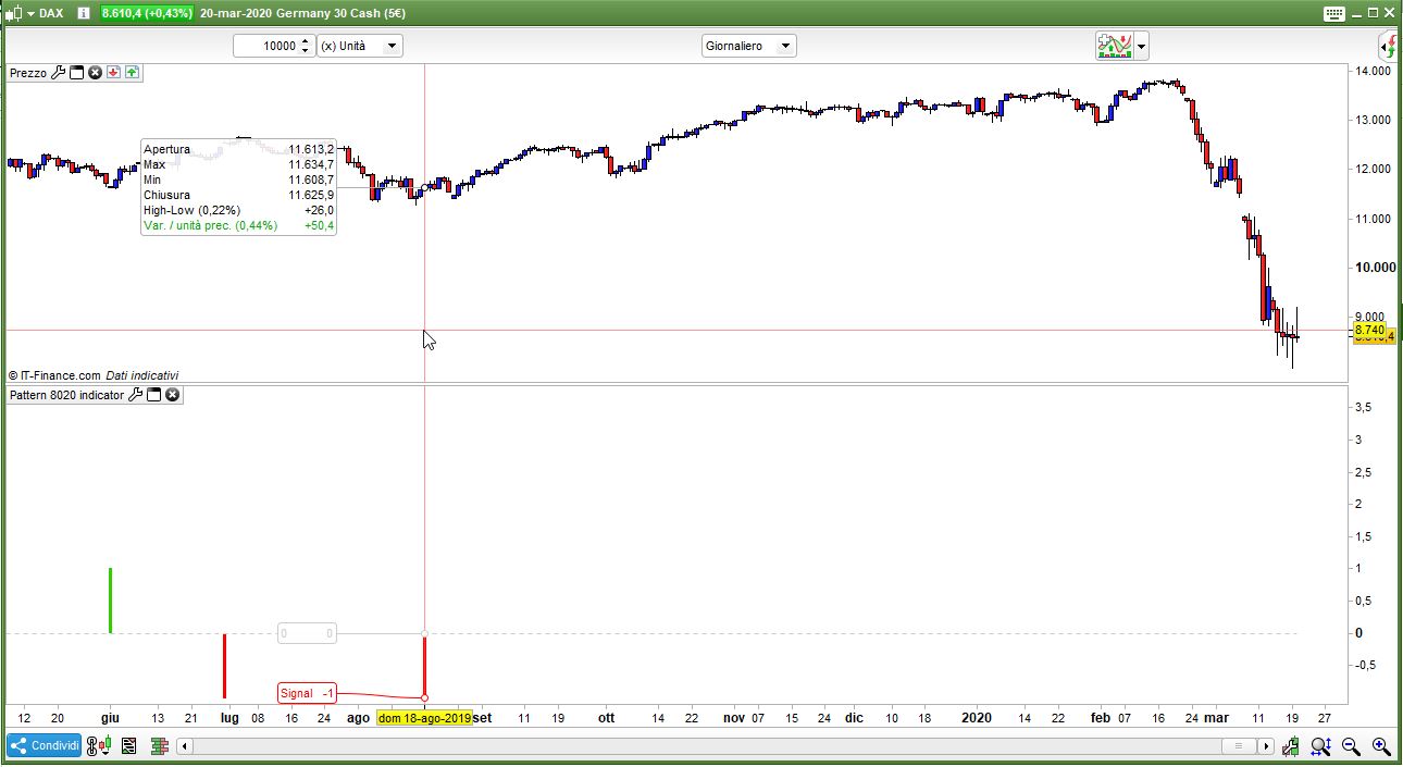 I pochi segnali sono dovuti al fatto che IG tratta i CFD ed hanno pochi gap, per cui è difficile che quel pattern venga trovato. Ho provato sulla versione 11 della PRT (opera sui Futures) ed è tutta un’altra cosa. Quando, e se, IB supporterà il trading automatico allora cambieranno le cose!