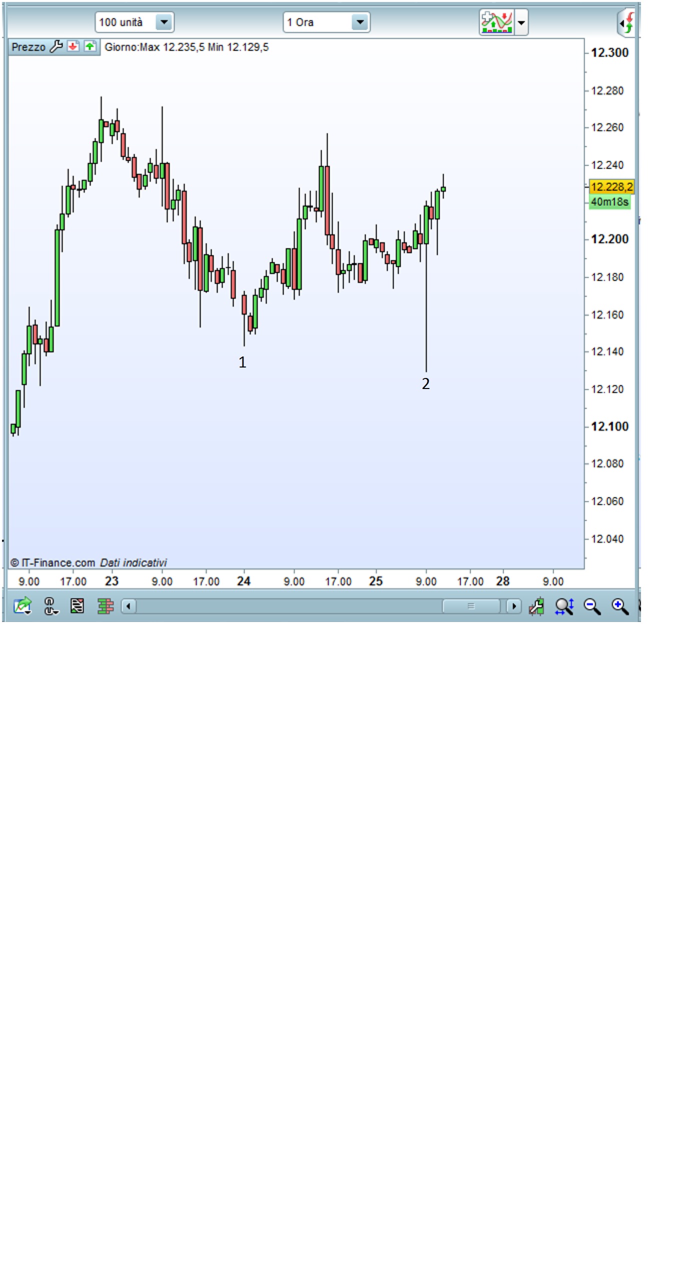 Es.: time frame 15 minuti: entro in posizione long alle 9:15 e lo stop è qualche punto sotto il minimo della candela delle 9:00. Incomincio a guadagnare e alle 9:30 lo stop si dovrà spostare qualche punto sotto il minimo della candela delle 9:15 e così via.