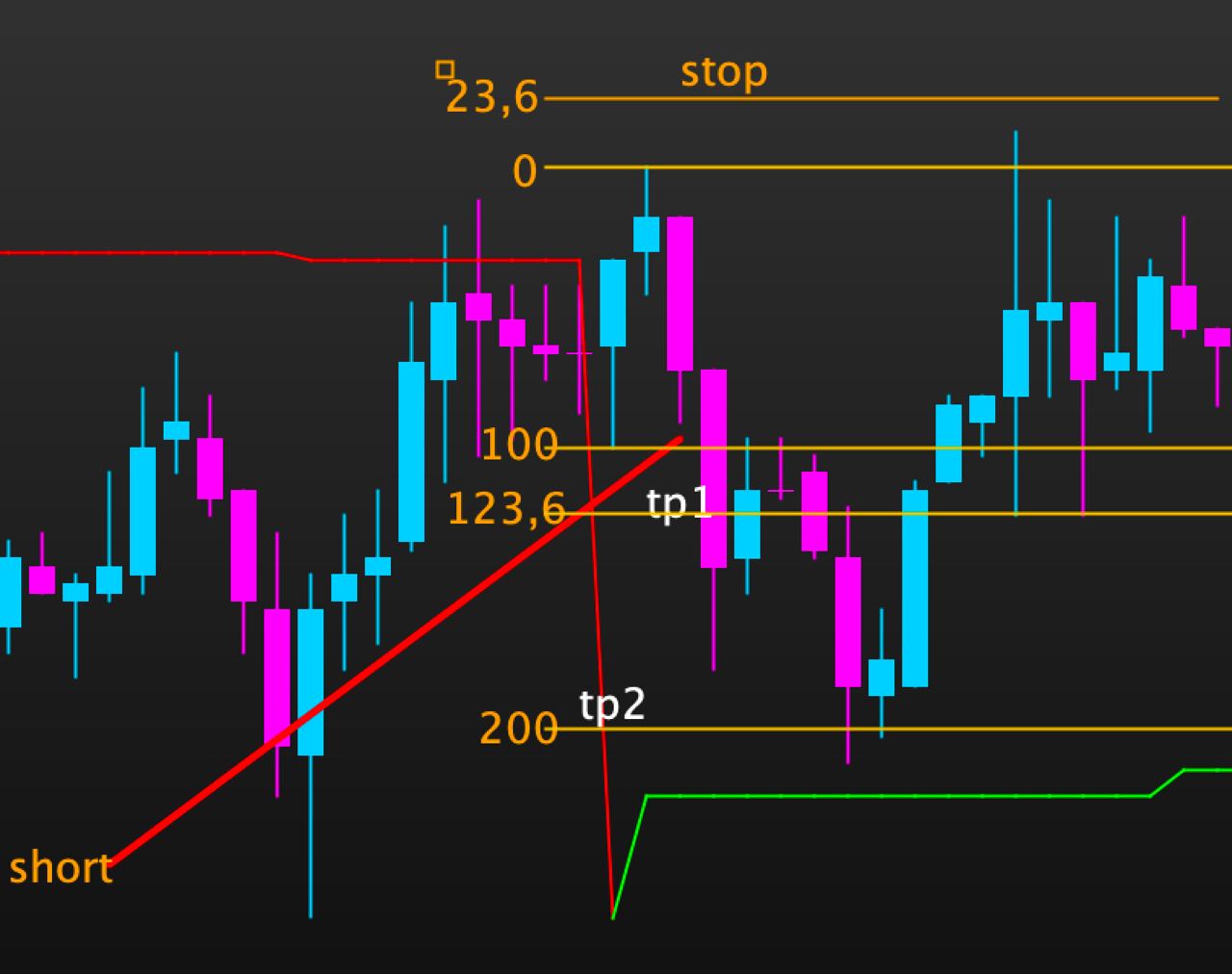 il target 1 è rappresentato dal 23,6% (123,6) di espansione del range delle due candele proiettato sotto i minimi , raggiunto il quale si mette lo stop in pari