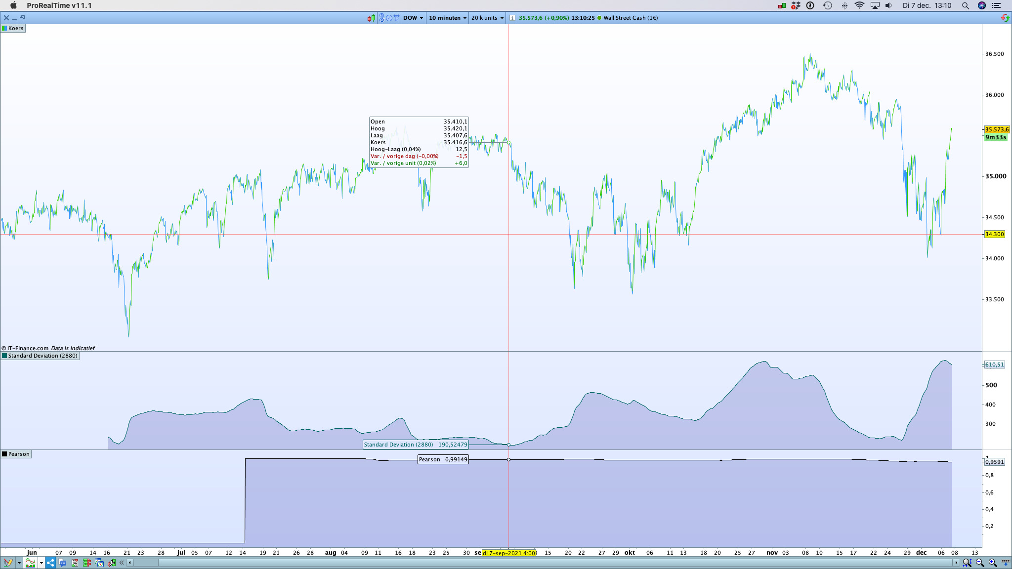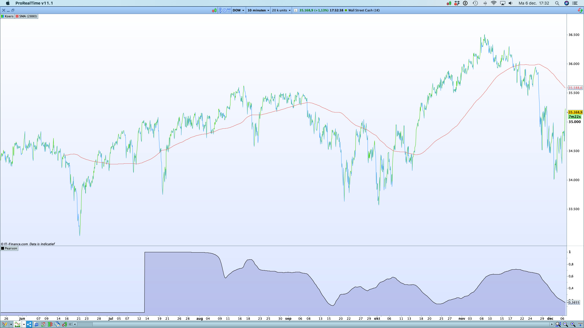If you look closely, the Pearson’s r goes down when the current price goes away from the average you have plotted or in case of sudden change of trend direction and/or acceleration of a move. Example end 25th of Nov./1st of Dec. the Dow “crashed” (-2000pts, -5.6%) and the r went down. In the definition, r range is +1 to -1. I guess, if you plot very fast average like Hull period 3, you would nearly always get a high r.