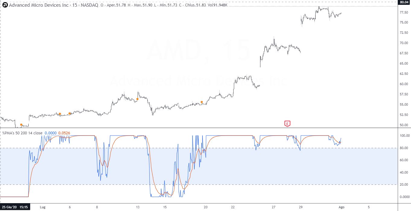 return per as "%Price Over SMA",ema as "Smoothed Result",80 as "superior",20 as "inferior"