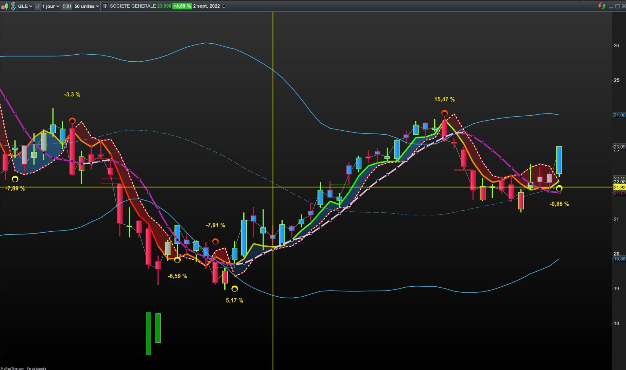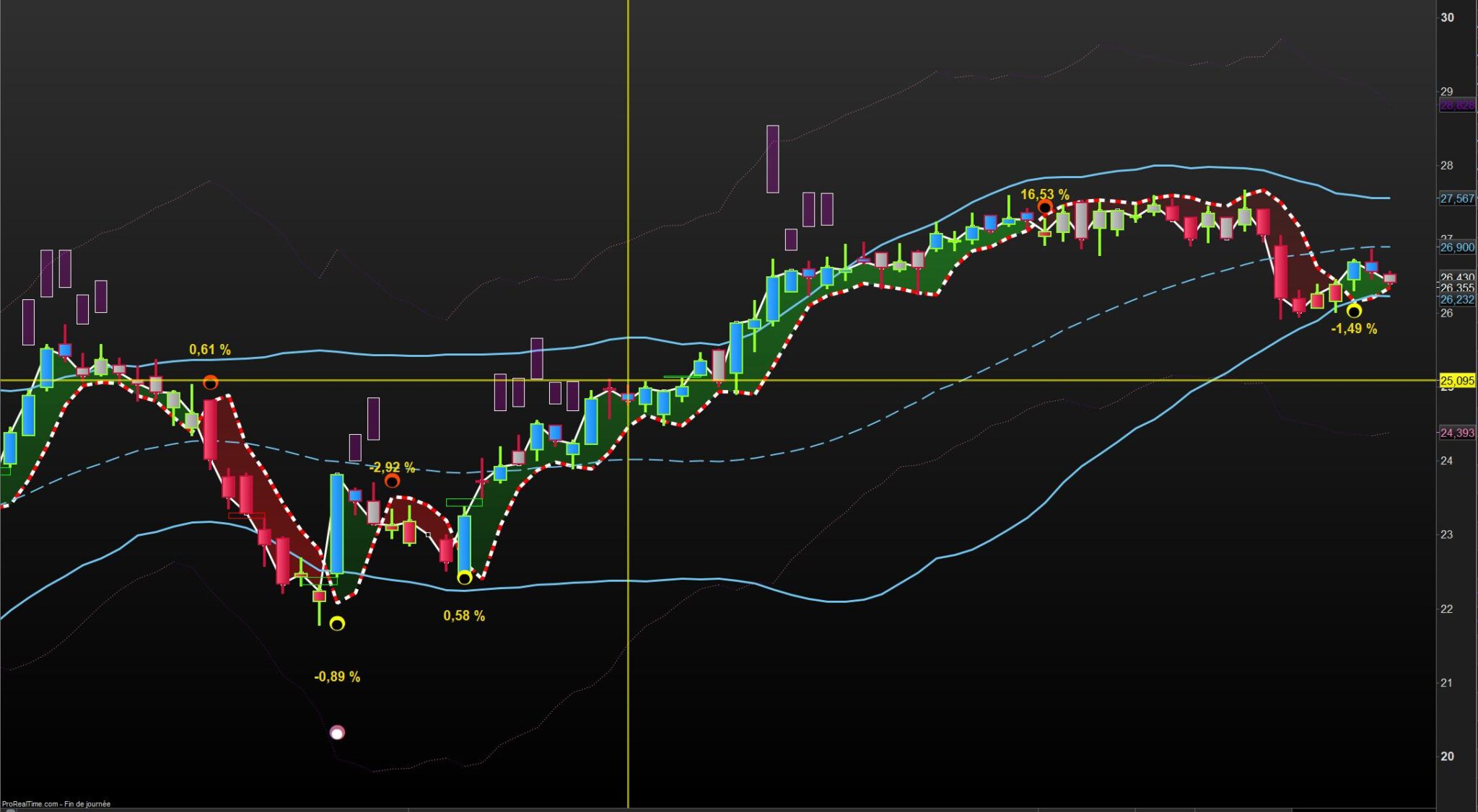 Cet indicateur me semble d’un intérêt certain , j’ai dessiné une stratégie en partant des bandes de Bollinger et de cet indicateur