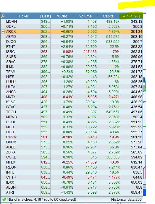 1) Throw the stocks that gets drawtext(“●”,barindex,fastln,Dialog,Bold,10) coloured(r,g,b)