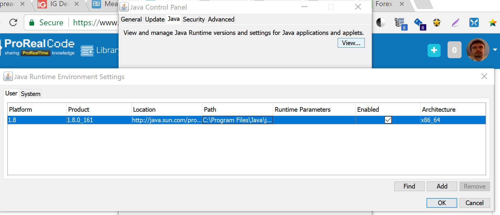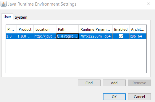 Thanks for your suggestions above verdi55. Glad to see it works for some on here but it doesn’t work for my setup unfortunately. This is what I have on my system for Java where I input “-Xmx12288m -64” into the runtime parameters field (to increase RAM to 12GB) after a bit of googling on the subject. When I check PRT it still allocates only a max 4GB of RAM to the application. Its a shame as I have tons of free RAM and would have liked to have this option so that my PC doesn’t slow down when I have lots of charts open as it can get fairly annoying at times.