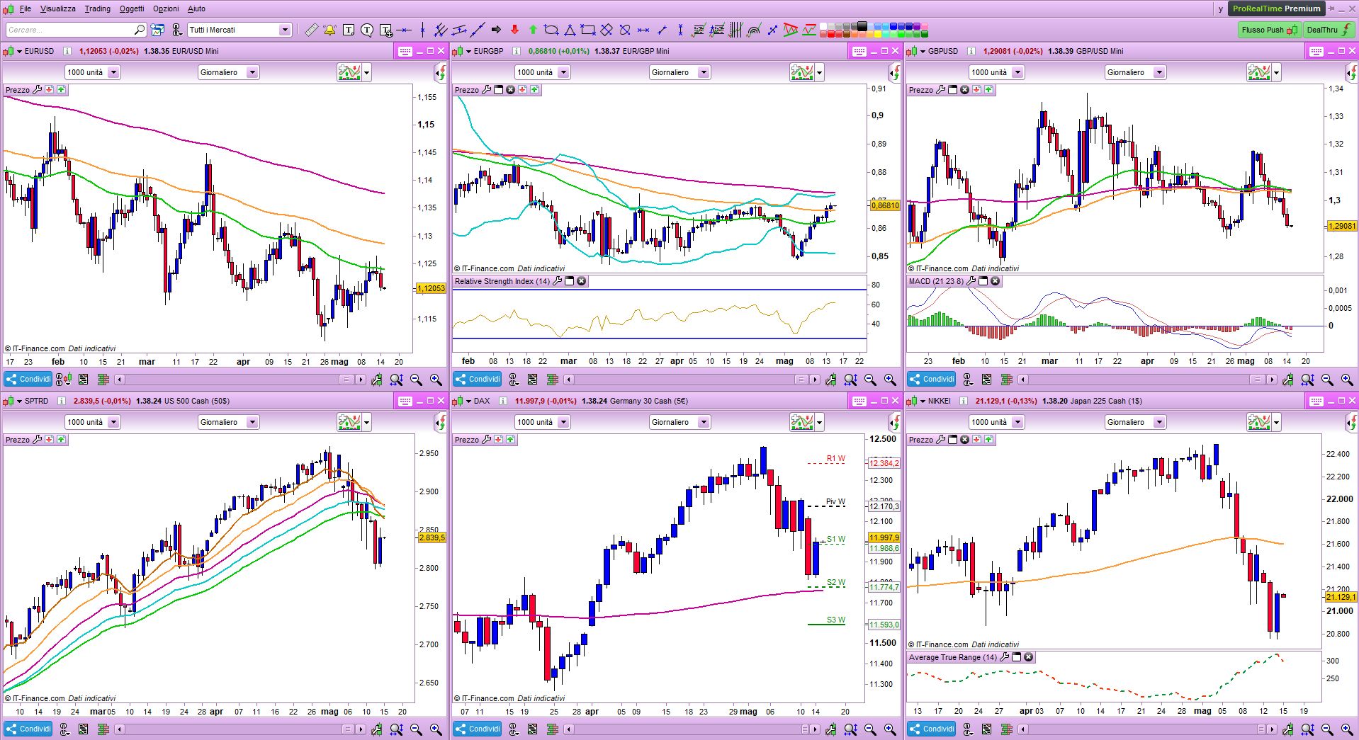 Devi crearti un piano di lavoro come ho fatto io nella foto allegata, dove ho messo 6 strumenti diversi (ne puoi mettere di più se vuoi, io sono arrivato fino a 12, sono un pò piccoli, ma li allarghi singolarmente quando devi operarci) con indicatori diversi l’uno dall’altro. Ho sempre usato lo stesso TF, ma puoi indicare anche TF diversi per ciascun grafico.