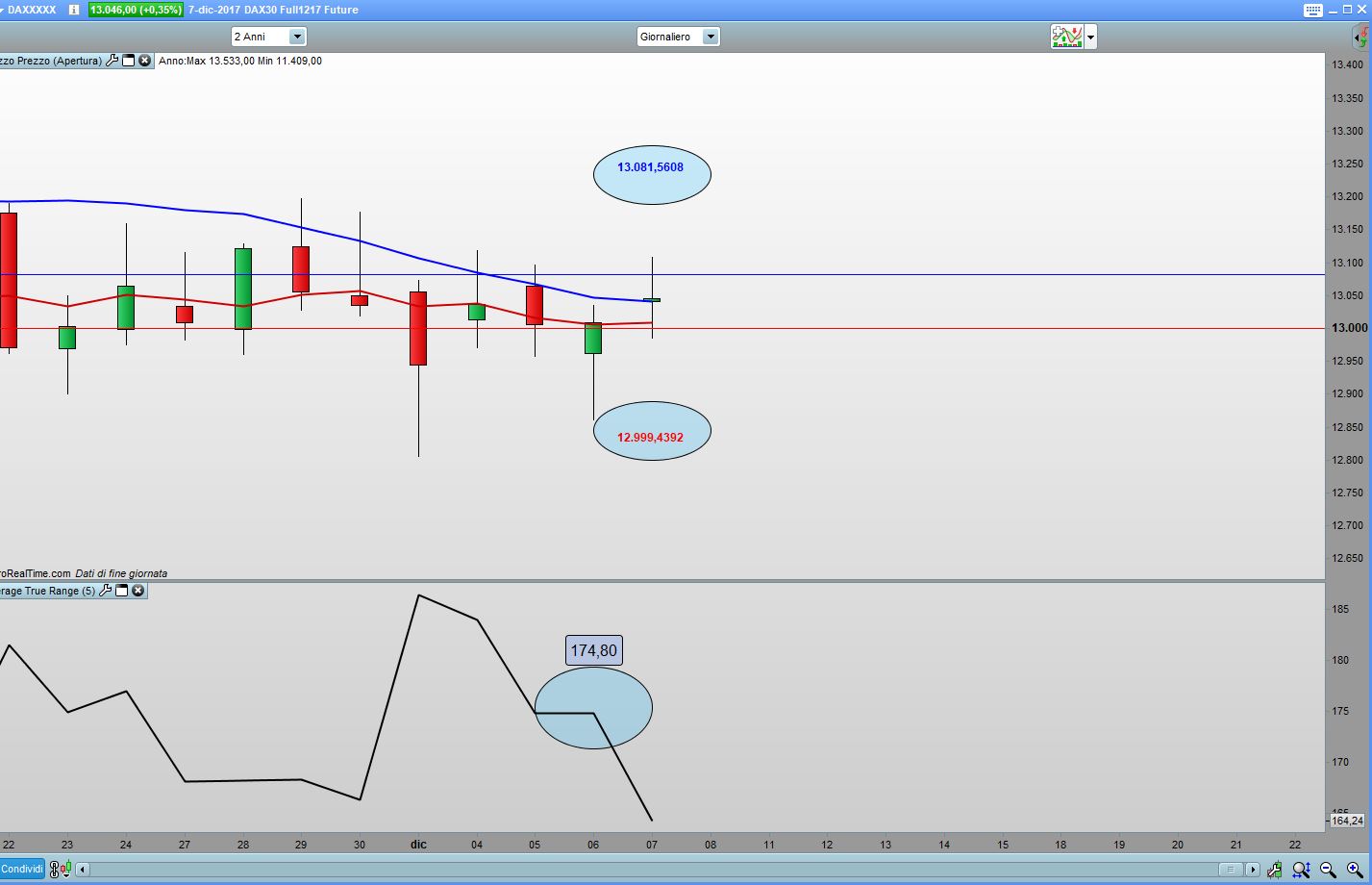 Ciao, non mi sembra corretto, l’atr a 5 periodi (a ieri ovviamente) sul dax è 174 punti circa il suo 25% è 43.5 il prezzo di apertura di oggi sul dax era 13040.5