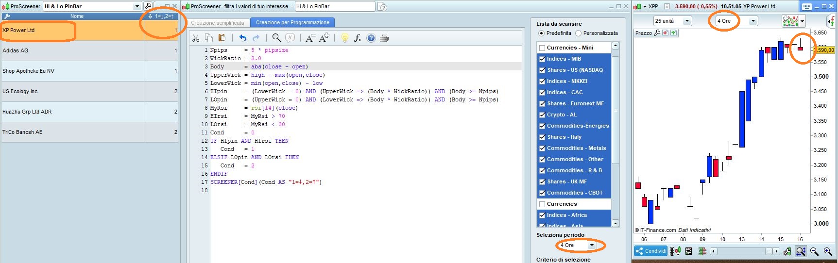 Salve, vorrei creare uno screener per ricercare una candela Pin bar alto/bassa che ha una ampiezza uguale o maggiore di 10 pips con una shadow almeno 2 volte il corpo, il corpo deve trovarsi ad una estremità e il colore della candela può essere sia rosso che verde non è importante.