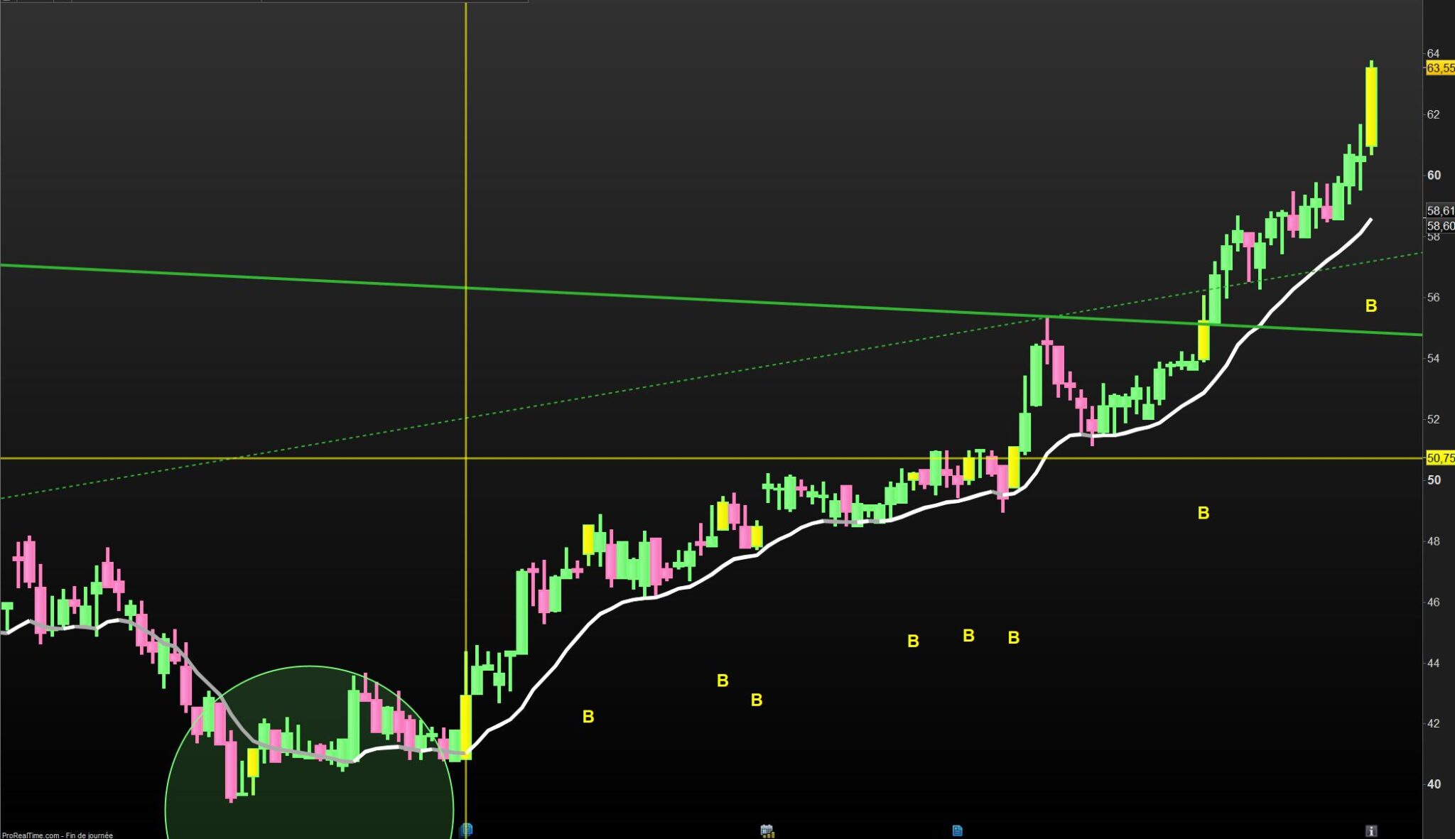 DRAWCANDLE(open, high, low, close) COLOURED(255,255,0) BORDERCOLOR(255,255,0) // Yellow candle when ‘long’ condition (crossover) is true