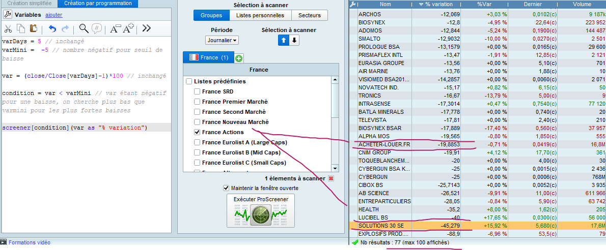 - multiples listes sélectionnées qui atteint le max 100 affichés avant d’atteindre les plus grosses baisses? (ou autre max selon version?) Dans ce cas si on voit jusqu’à -15%, refaire tourner avec un varmini=-15 pour voir la suite de -15 à …