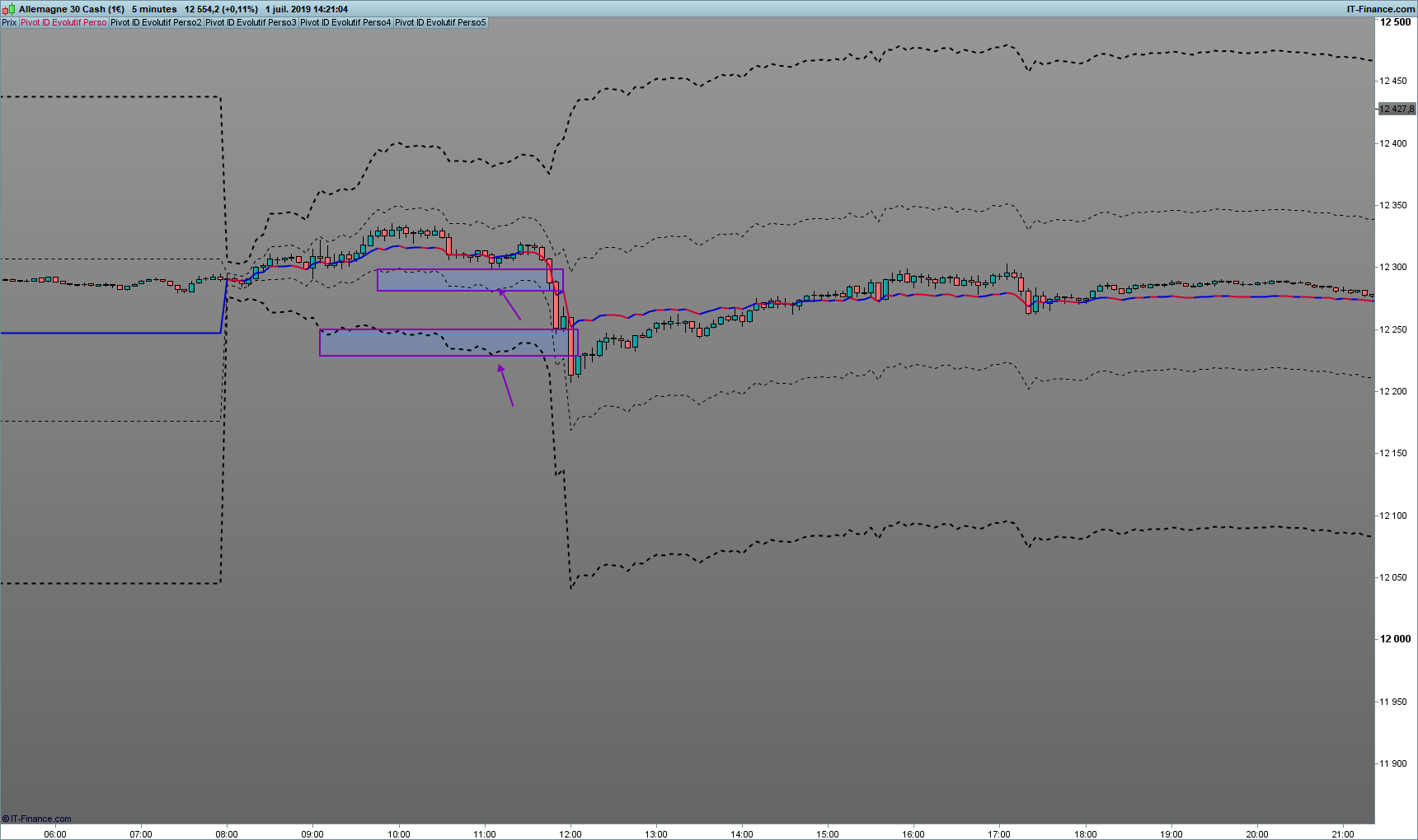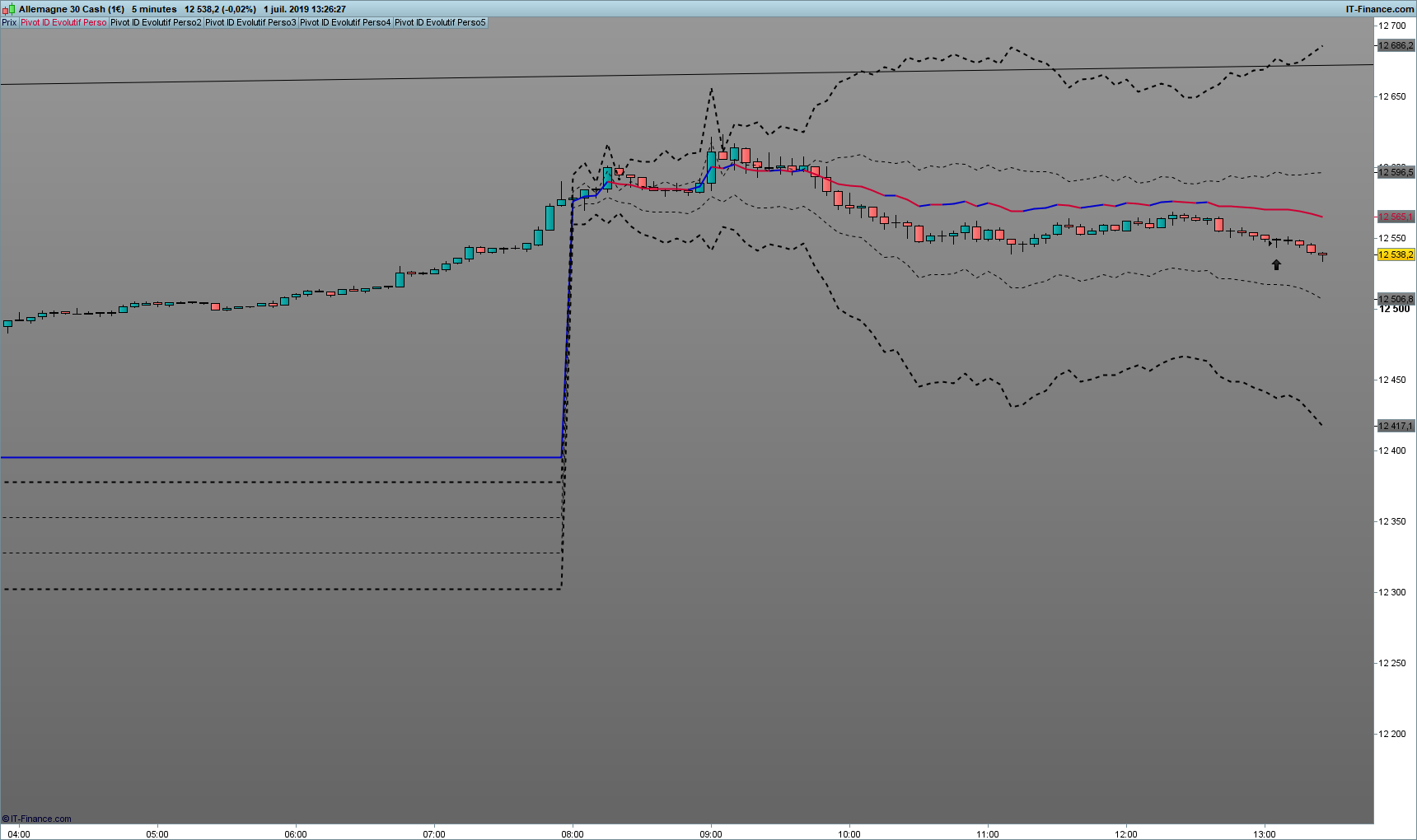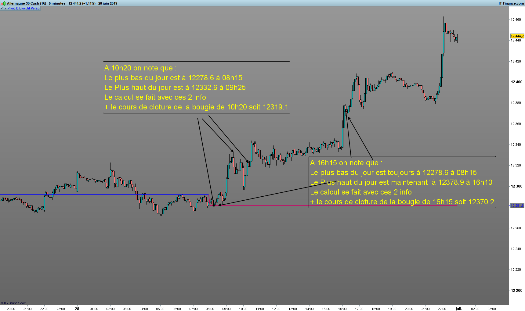Le principe est que le Point Pivot soit calculé à chaque close de bougie en prenant en compte le plus haut et le plus bas depuis le Point de départ du jour (0800am).
