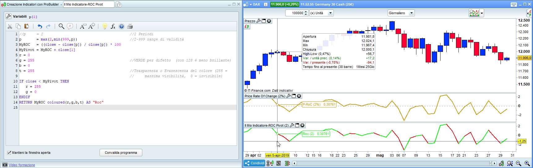 Chiusura di oggi – chiusura dell’altro ieri, questo crea la linea roc; aggiungendo il pivot (= valore del roc + la chiusura di ieri) si determina se la linea roc venga colorata di verde o di rosso: sarà verde se la chiusura di domani è maggiore del pivot, o sarà rossa se la chiusura di domani è minore del pivot.
