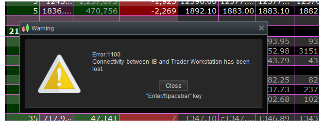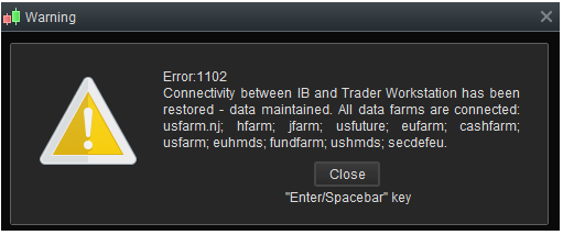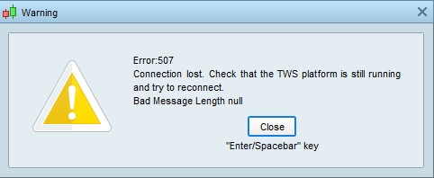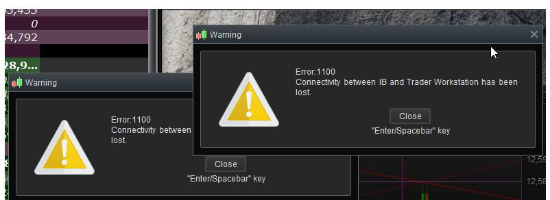 From the same sequence of screenshots I made about this, I also find the one you see in the first attachment (also more than one message at the same time). Notice that this is PRT showing the message, while the content of the message seems wrong, but it not really (as it seems). I mean, look at the background in the 2nd attachment. That is TWS which is inactive. As far as I can recall this initiates such a fault situation because you yourself (in my case, that is) caused TWS to disconnect, for example by means of making a connection with the (IBKR) mobile app. THAT now chokes the PRT connection with TWS (quite obviously) but that is the unexpected situation. Do notice that TWS stays live for a minute or so WHILE it is officially not connected to IB indeed (thus, content of the message would be correct).