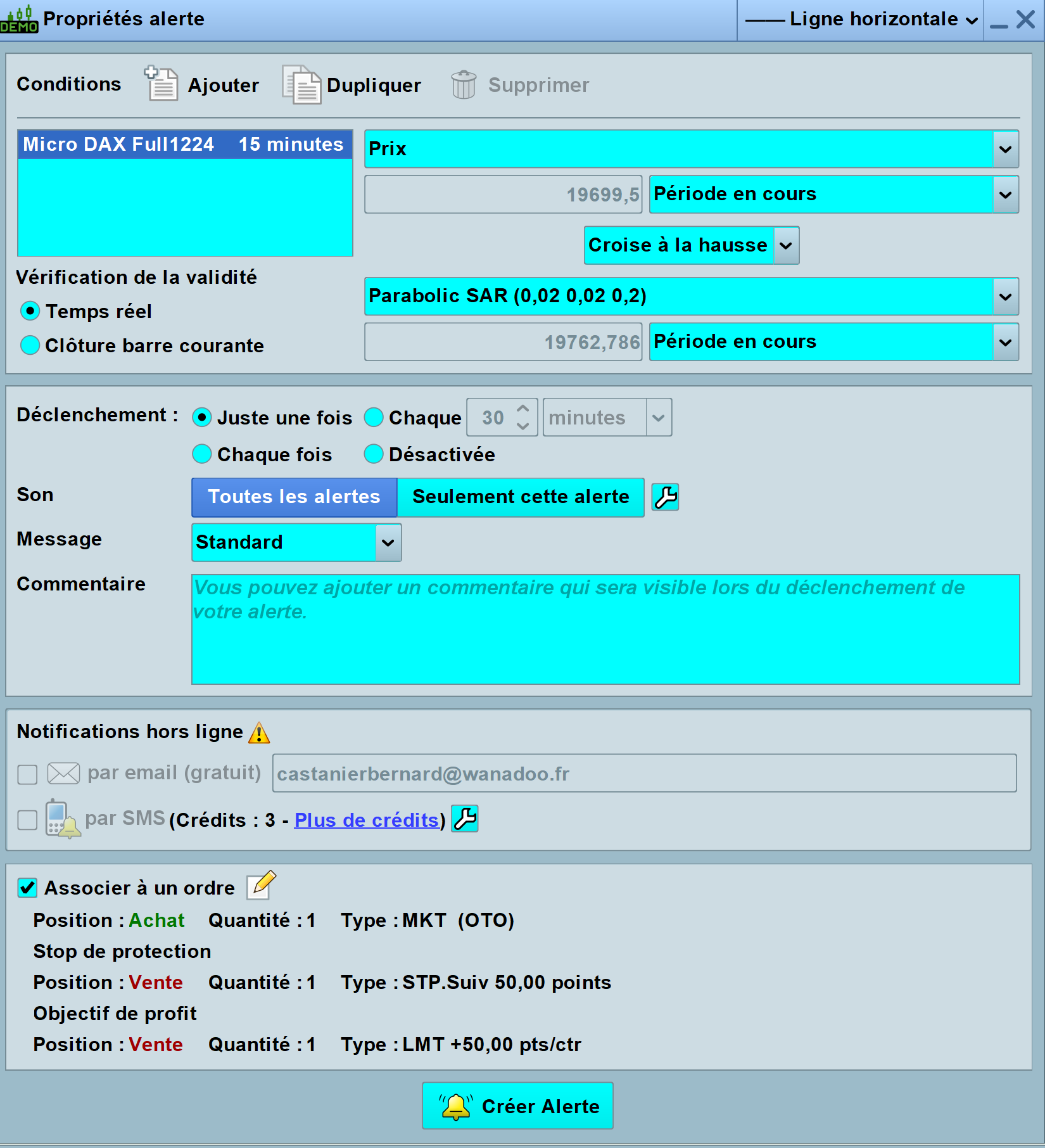 Voila comment je poste une alerte en associant un ordre d’achat avec un stop suiveur et une vente limite