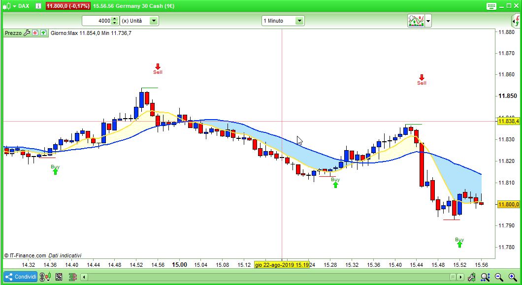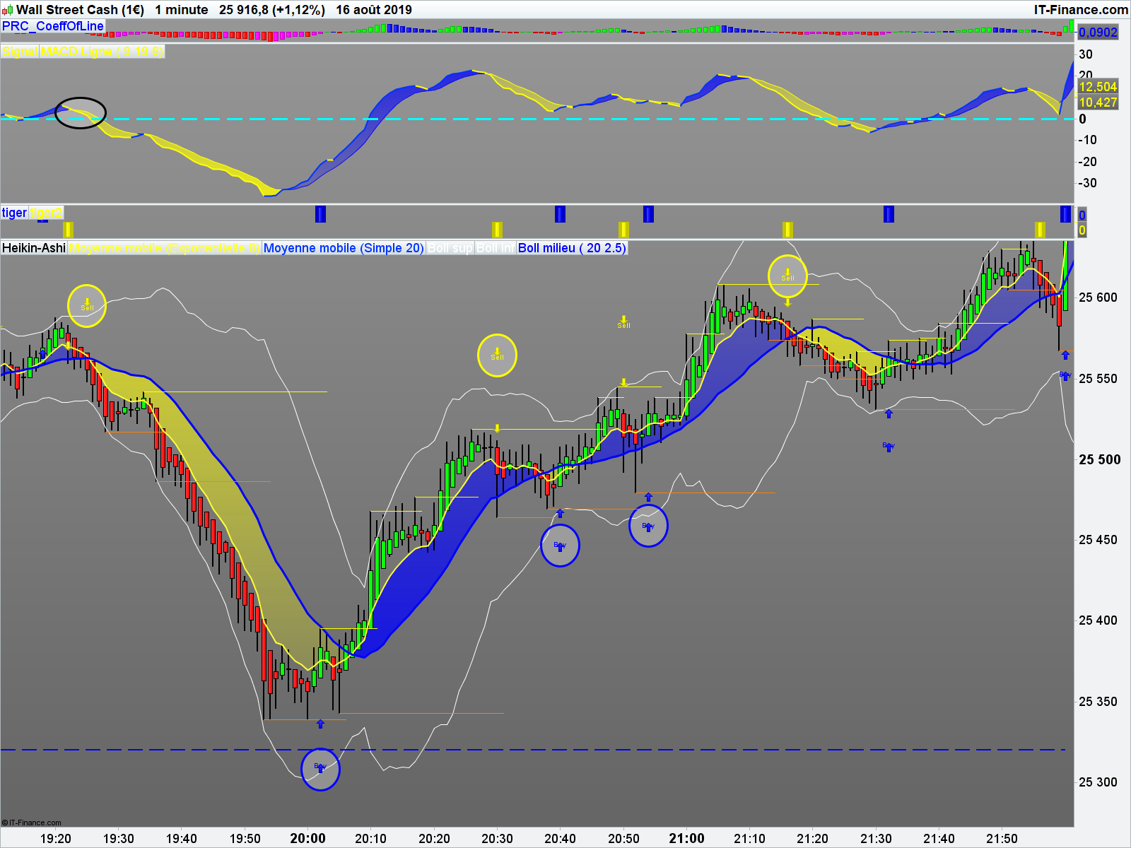 sur le dow 1mn les signaux me semblent corrects, qu en pensez vous? filtrer les long si cours >m20 peut etre. et inversement. c’est pourquoi j aimerai savoir si en fonction des filtres validés , la grosseur de la flèche BUY peut varier.