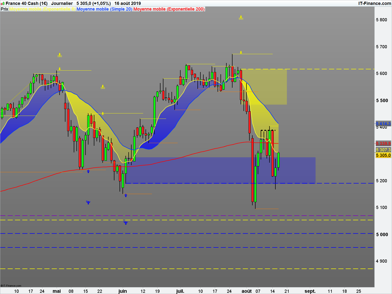 pour un tiger short, j aimerai placer une ligne pointillée blanche au niveau de la clôture de la bougie signal et qui dure jusqu’à apparition d’un tiger Buy, une ligne pointillé jaune au niveau du plus haut de la bougie signal, et une ligne orange au niveau du plus haut de la bougie qui précède le tiger short.. Le Tp idem une ligne pointillé verte pour chaque Tp, j ai mis 20/40/60 car le dax fait souvent ce range sur impulsion. même si al volatilité est plus forte en ce moment donc les TP seront ajustable.si le cours repasse au dessus . Pour les tiger buy idem ligne blanche pour la clôture du tiger buy, une ligne bleu foncé pour le plus bas de la bougie ( c’est un support ou on peut encore rentrer dans le trade mai ça devient limite si on le touche et bleu clair sur le plus bas de la bougie qui précède le Tiger Long . si c’est touché on reverse le signal. Idem que ces lignes lignes continuent jusqu’à l apparation d’un signal Tiger short. Merci bien.