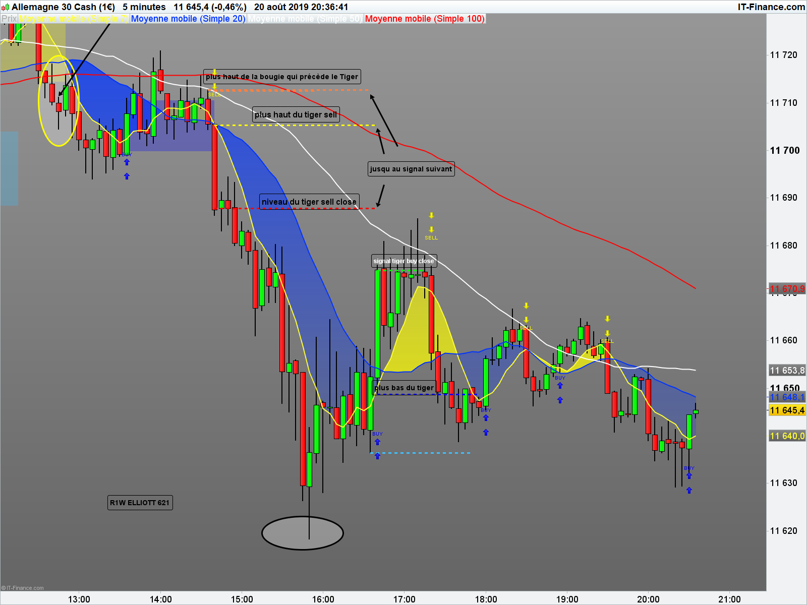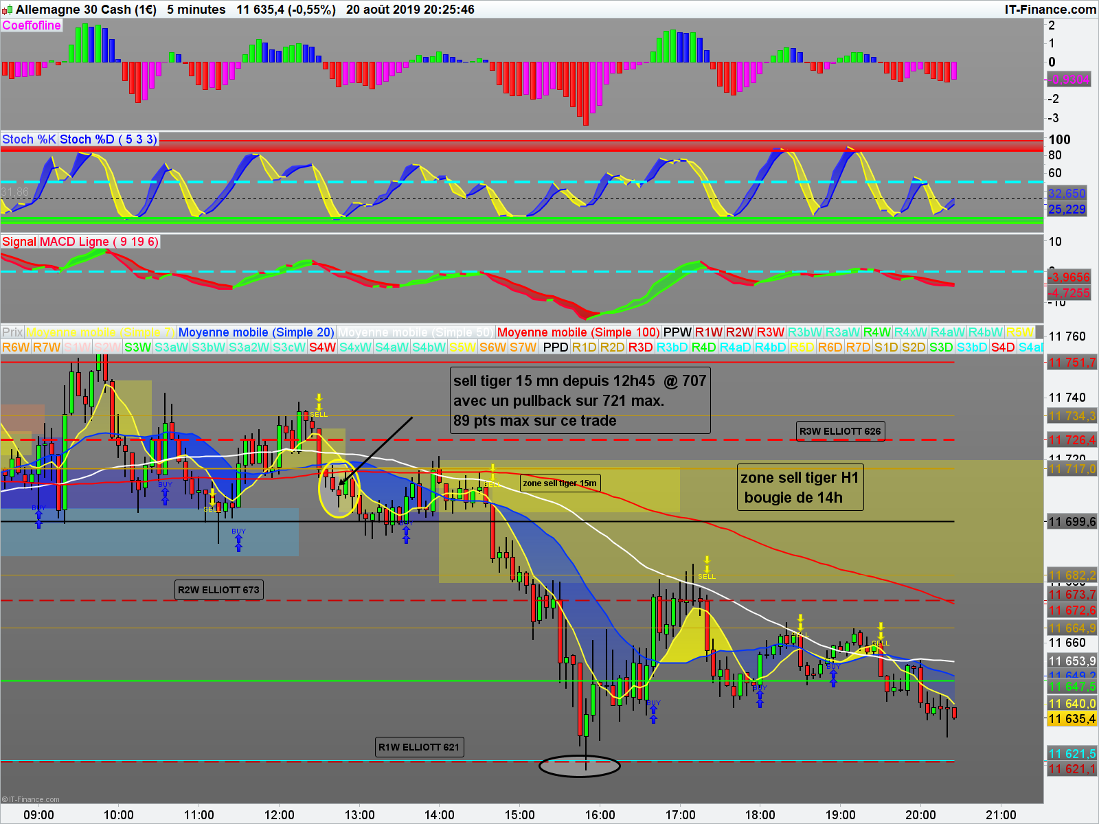 Sur le dernier graphe, en effet le tiger short est bien en 5mn. Mais ce que j ai voulu montrer est qu’un tiger short 15mn apparaît à 12h45, ce qui renforce le signal de 12h30. donc on reste en short jusqu à avoir un tiger Long en 5mn qui apparaît à 13h35. @11699. par la suite, ce niveau est cassé à 14h40 ce qui renforce le signal tiger sell qui apparaît sur la bougie de 14h40.