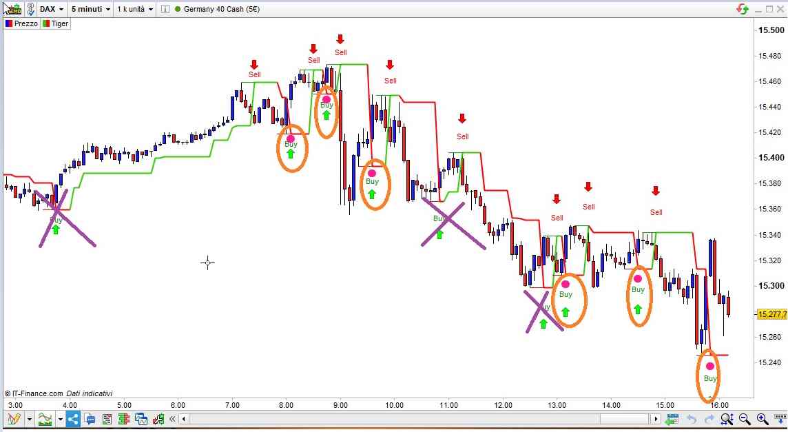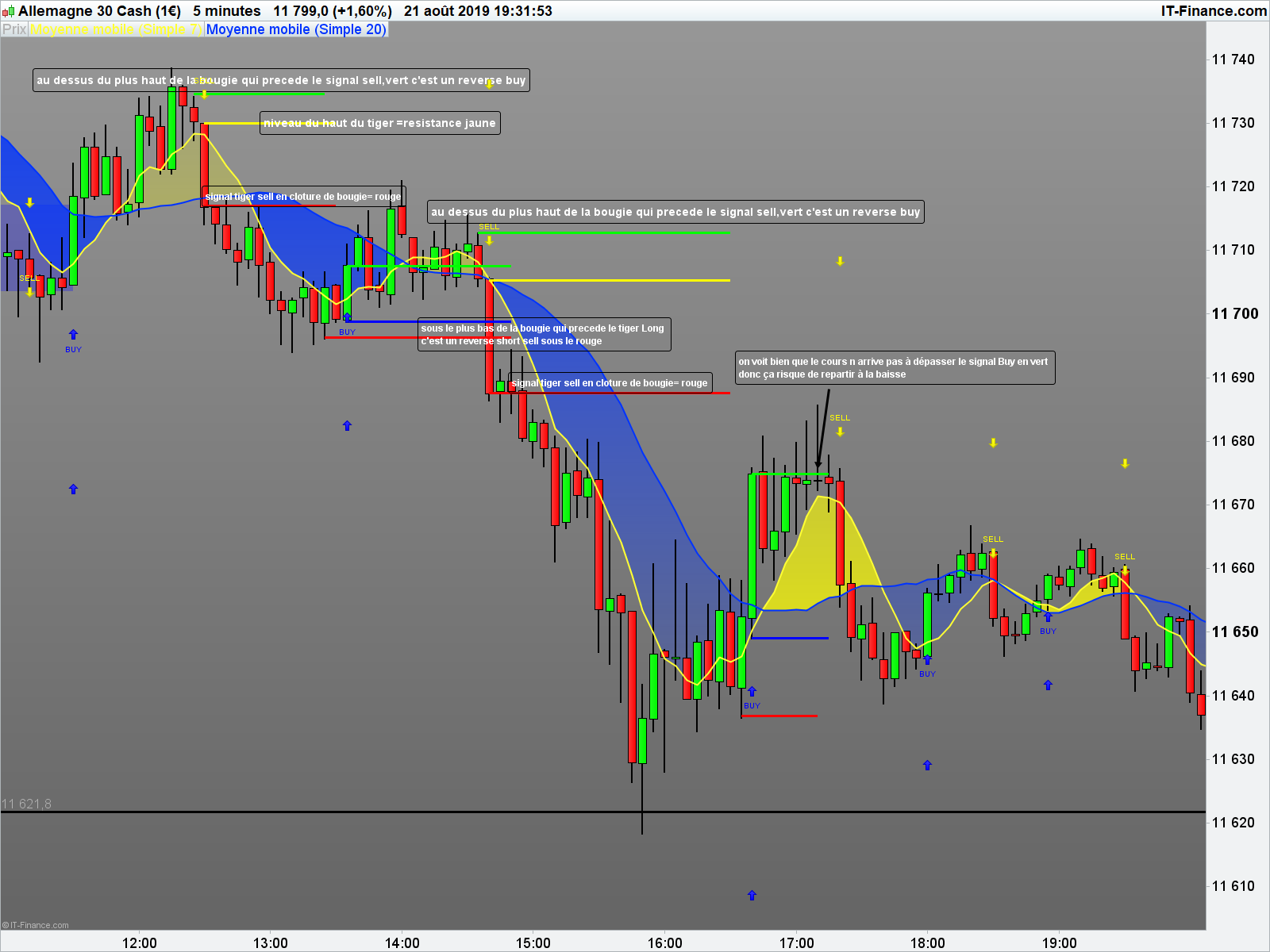 Roberto, le plus important est sur une bougie signal ici à 12h45 de mettre une ligne pointillée jaune au niveau du plus haut du Tiger ( qui va devenir une résistance), une autre sur le plus haut de la bougie qui précède la bougie du Tiger en orange. si celle ci est cassée up, alors le SELL est inversé et on passe Buy. pour les tiger buy, une ligne pointillée bleu marine sur l bs du signal Tiger, un pointillé bleu cien au niveau du plus abs de la bougie qui précède l etiger, en dessous c’est un reverse sell. Voilà dans un premeir temps. Merci davance.