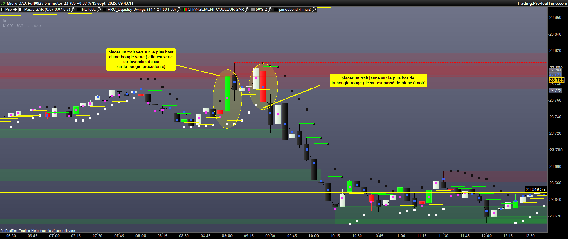 avec le sar 0.07/0.07/0.7 les signaux sont clairs. quand il y a une inversion de sar de baissier (noir) à haussier(blanc), la bougie passe vert. J’aimerais placer un trait vert sur le plus haut de cette bougie. Et inversement quand le sar passe de blanc à noir, la bougie devient rouge et il faudrait placer un trait jaune ( plus visible que le rouge) sur le plus bas de cette bougie. Merci .