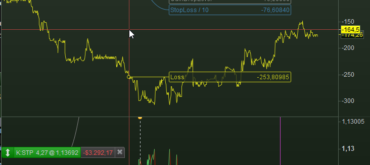 But also have a normal SL which is sufficiently high to avoid the error – and which adds safety in case your calculation of LostEnough fails on you. You see it below, were the active SL in the program is 766 (blue graph) and the technical Set Stop command is way higher at 3292 (you must calculate yourself what is sufficiently high to avoid the error at all times). In the 2nd attachment you see one occurring (at a little higher value – it is all dynamic in my situation); just caused by an Exit Short in this case.