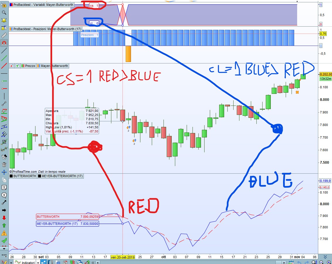 It seems that the backtester almost always sees the Blue > Red .. which is not true..
