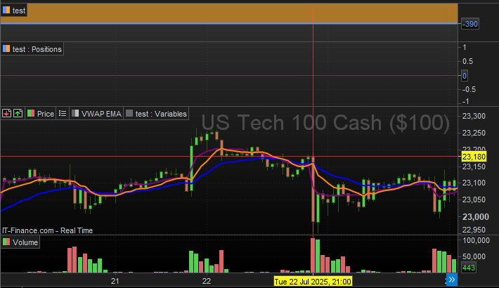 not shortEmaDirection and (rsi < 50) and (close < vwap) and isTradeWindow and isRegularSession // Entry/Exit tracking var int longEntryBar = na var int shortEntryBar = na var float longEntryPrice = na var float shortEntryPrice = na // Execute trades only on confirmed bars if (longCondition) strategy.entry(“Long”, strategy.long, qty=tradeQty) longEntryBar := bar_index longEntryPrice := close if (shortCondition) strategy.entry(“Short”, strategy.short, qty=tradeQty) shortEntryBar := bar_index shortEntryPrice := close // Exit logic – non-repainting strategy.exit(“Exit Long”, “Long”, stop=longEntryPrice – atr * initialStopLossMultiplier, trail_points=atr * trailStopATRMultiplier, trail_offset=atr * trailStopATRMultiplier / 2) strategy.exit(“Exit Short”, “Short”, stop=shortEntryPrice + atr * initialStopLossMultiplier, trail_points=atr * trailStopATRMultiplier, trail_offset=atr * trailStopATRMultiplier / 2) // Break-even logic – non-repainting breakEvenTrigger = breakEvenTriggerMultiplier * atr if (strategy.position_size > 0 and close > longEntryPrice + breakEvenTrigger)