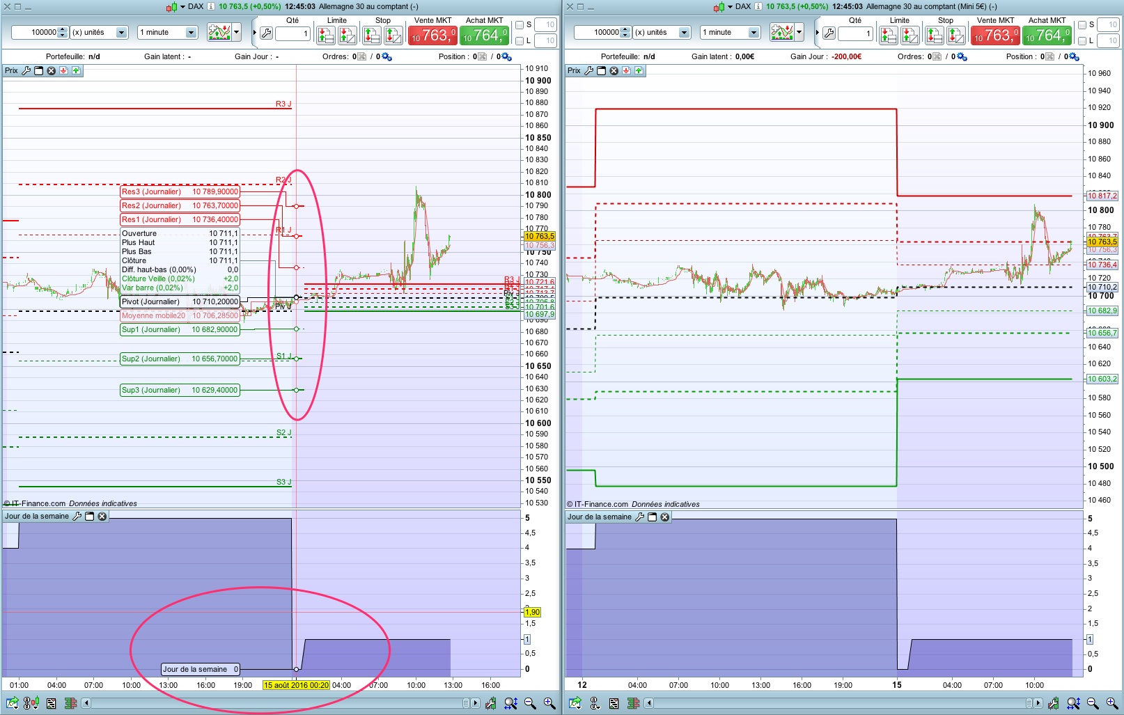 En cochant afficher les données du week-end, on voit bien (cf copie écran en PJ cadre de gauche) que pendant une heure PRT considère des données du dimanche puisque dayofweek renvoi la valeur 0 (pour rappel le CFD DAX IG ne cote pas le WE). On voit aussi que PRT affiche des pivots le dimanche calculés sur ces bases DHigh, DLow et Dclose du vendredi pendant seulement 1 heure, puis recalcule des pivots erronées suivant les données DHigh, DLow et DClose de ce “faux” dimanche.
