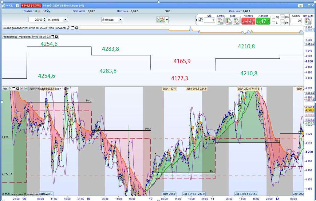 J’ai essayé l’indicateur de Marc (doctrading), qui fonctionne très bien, mais je constate qu’il “saute” les valeurs du WE. Comme je fait les test sur le WTI, la cotation continue les WE comme on peut le constater sur le graph.