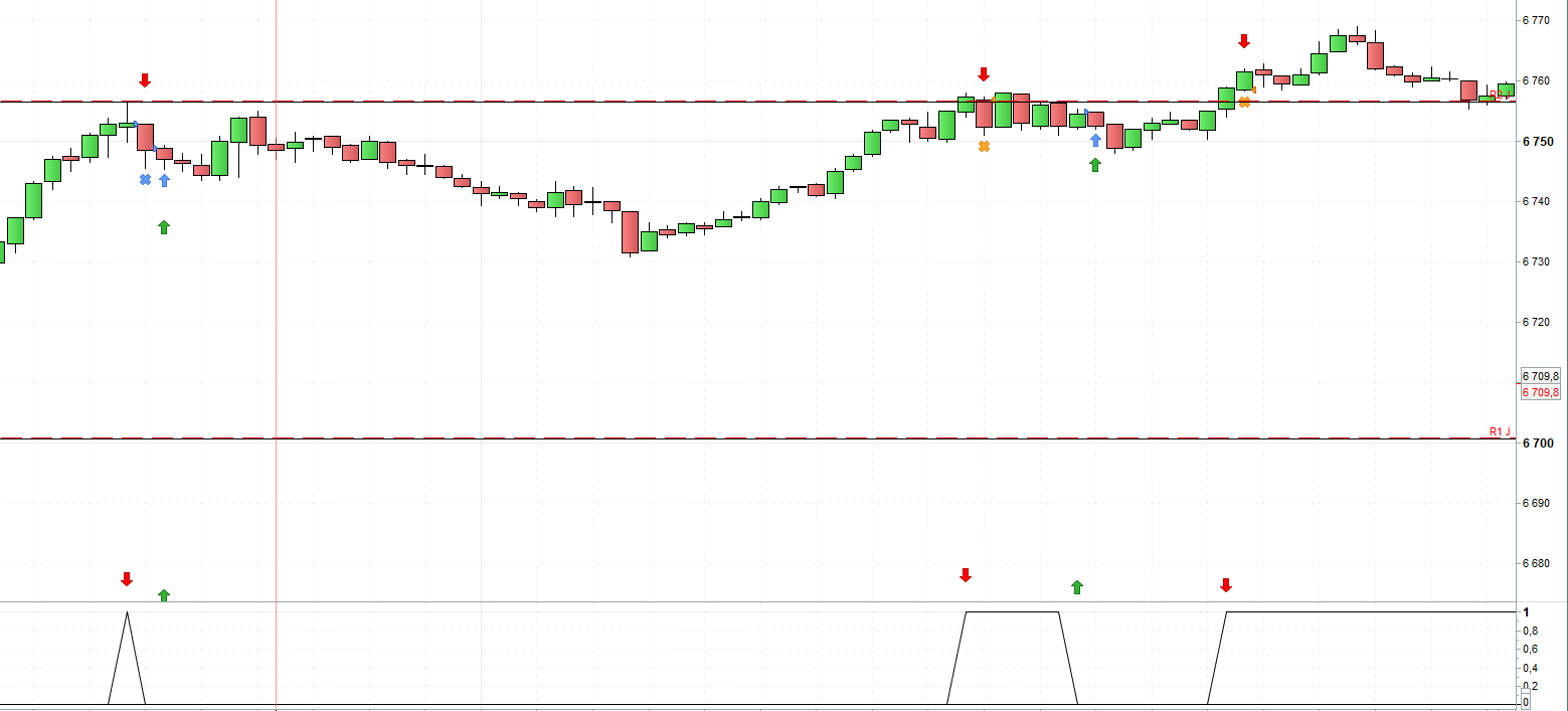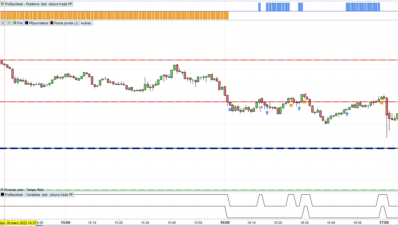 La bonne nouvelle c’est que la seule fois ou le prix est passé au dessus de la R3 le trade en cours s’est clôturé au bon moment (voir 1ere image). Par contre le soucis c’est que les signaux Z et Y s’activent sans raison à de multiples reprises et donc clôturent les trades en cours (voir 2nd image). Pire, à certains moment Y=1 et Z=-1 au même moment…
