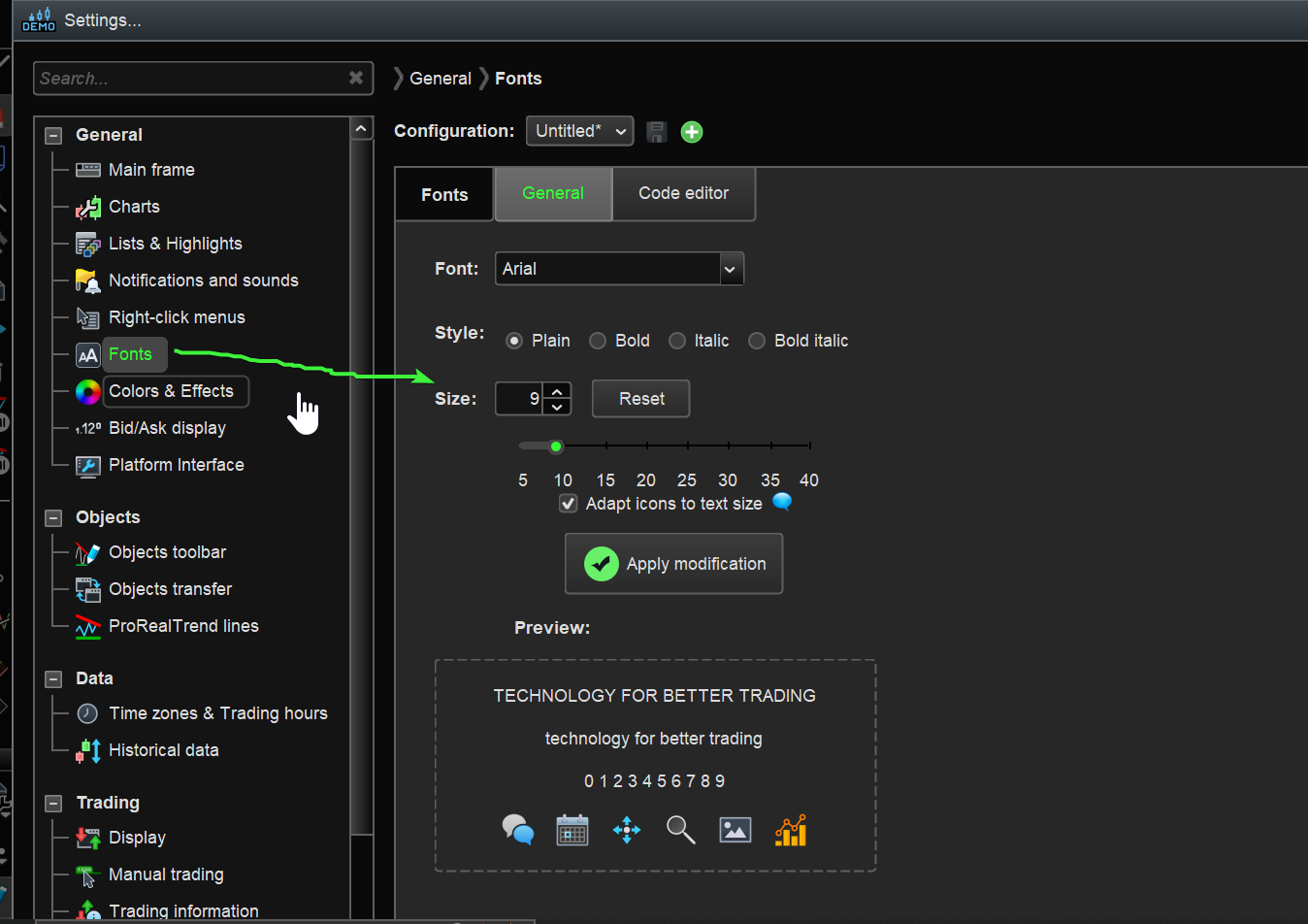 Dans la barre d’outils principale, Paramètres > Plateforme, voir ci-joint pour la taille de police.