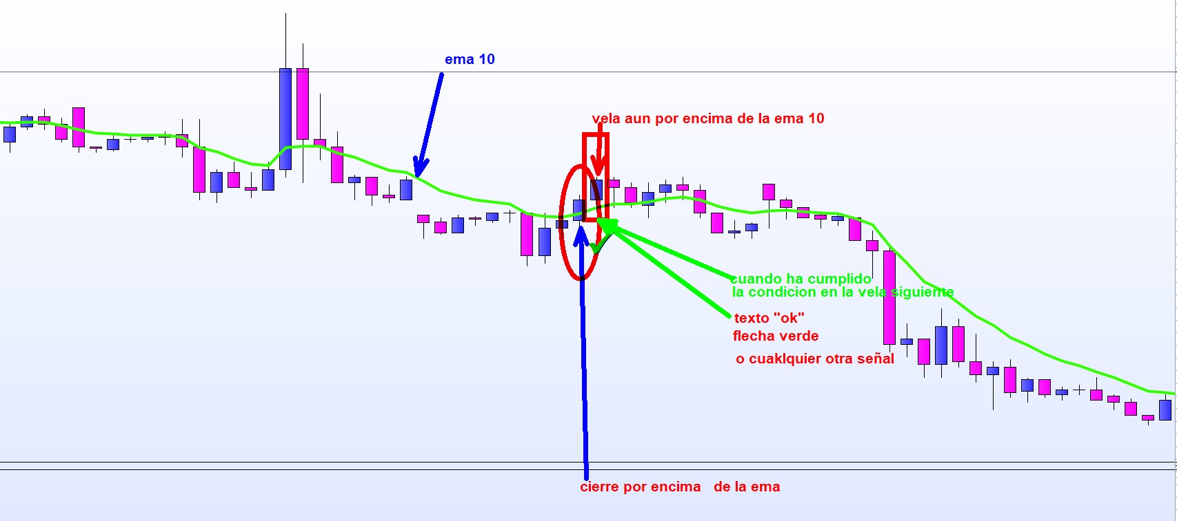 Buenas tardes , quisiera preguntar si es posible colocar una flecha cuando pase una vela hecha una condicion…es decir,,ejemplo..cuando el cierre de la vela cruce la ema 10..en la sigueiente vela si sigue estando por encima de la ema 10 que me marque una señal,,flecha tecto o lo que sea