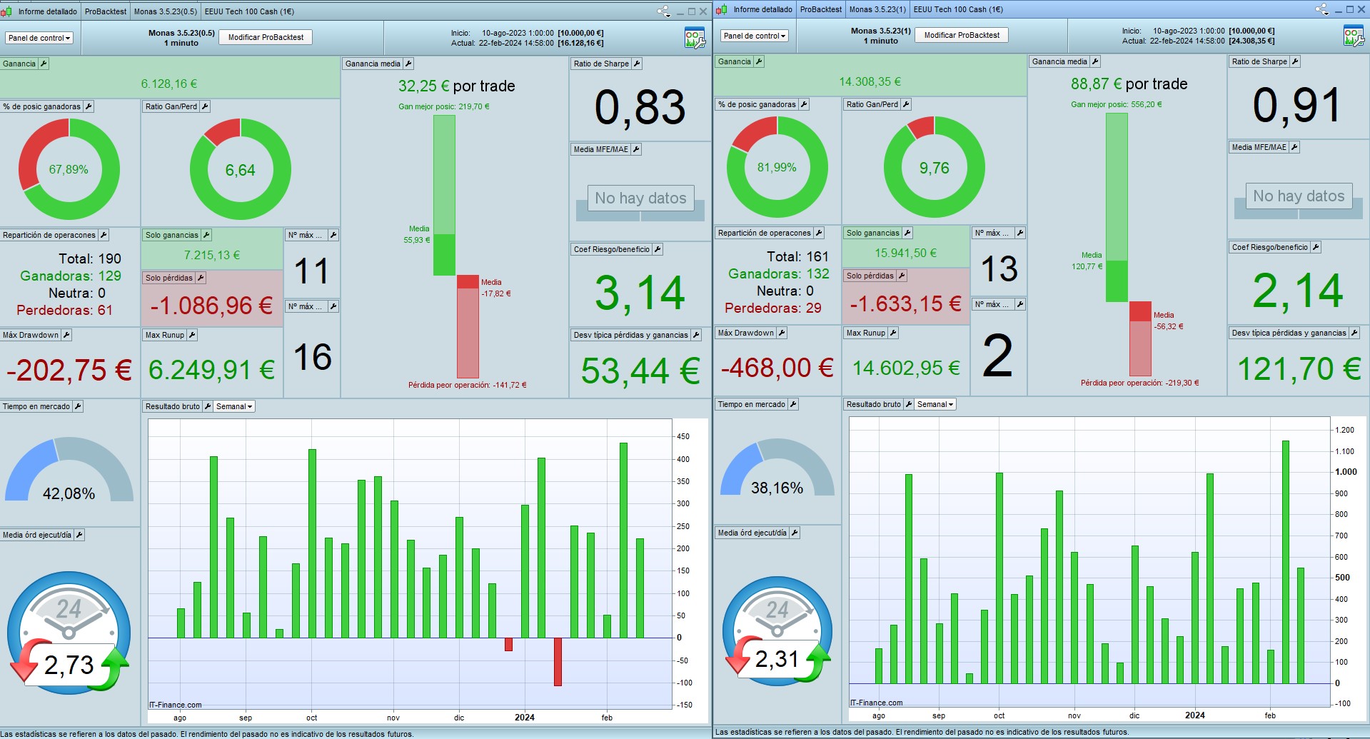Adjunto una comparativa 200k: a la izquierda la estrategia operando con 0.6, 0.7 y 0.8; a la derecha, la misma estrategia operando 1, 1.5 y 2 contratos.